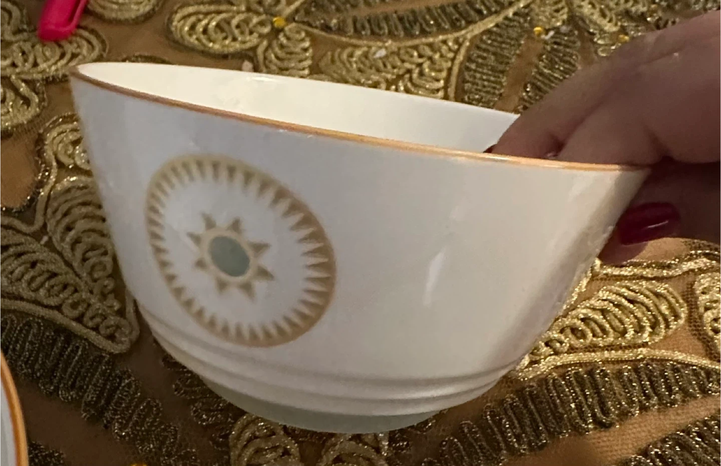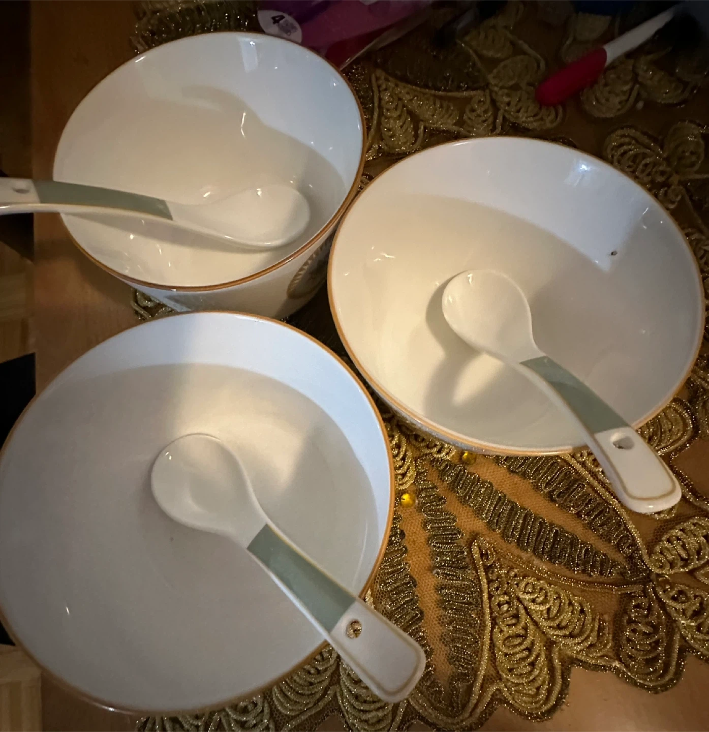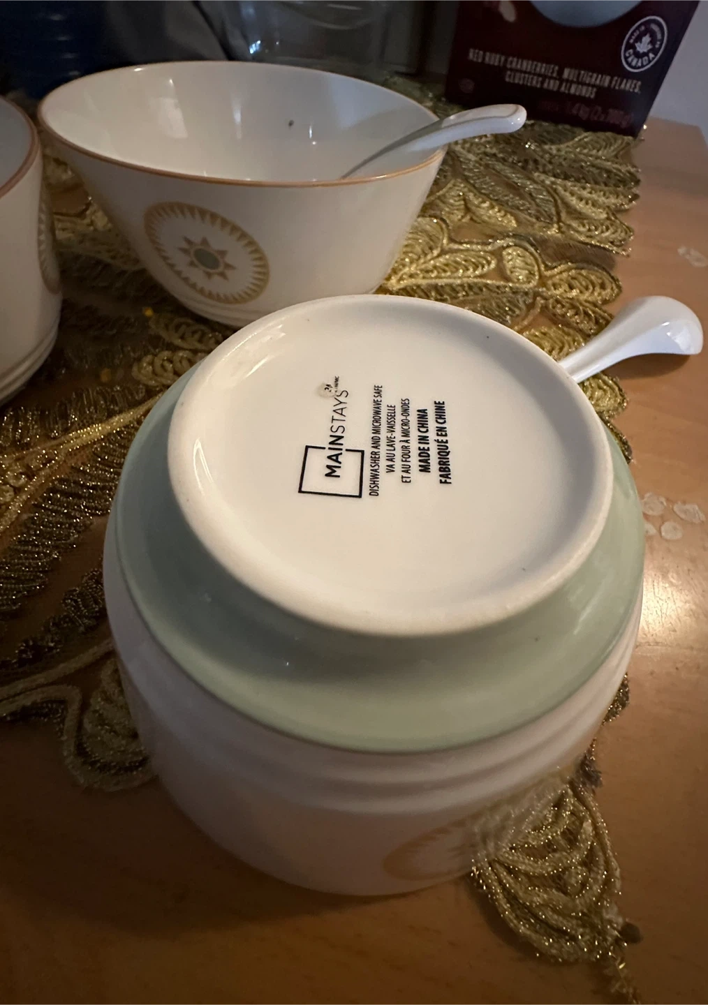 Set of three Mainstays soup bowls, each with a matching spoon. White ceramic with a decorative sunburst pattern and gold trim. Dishwasher and microwave safe.