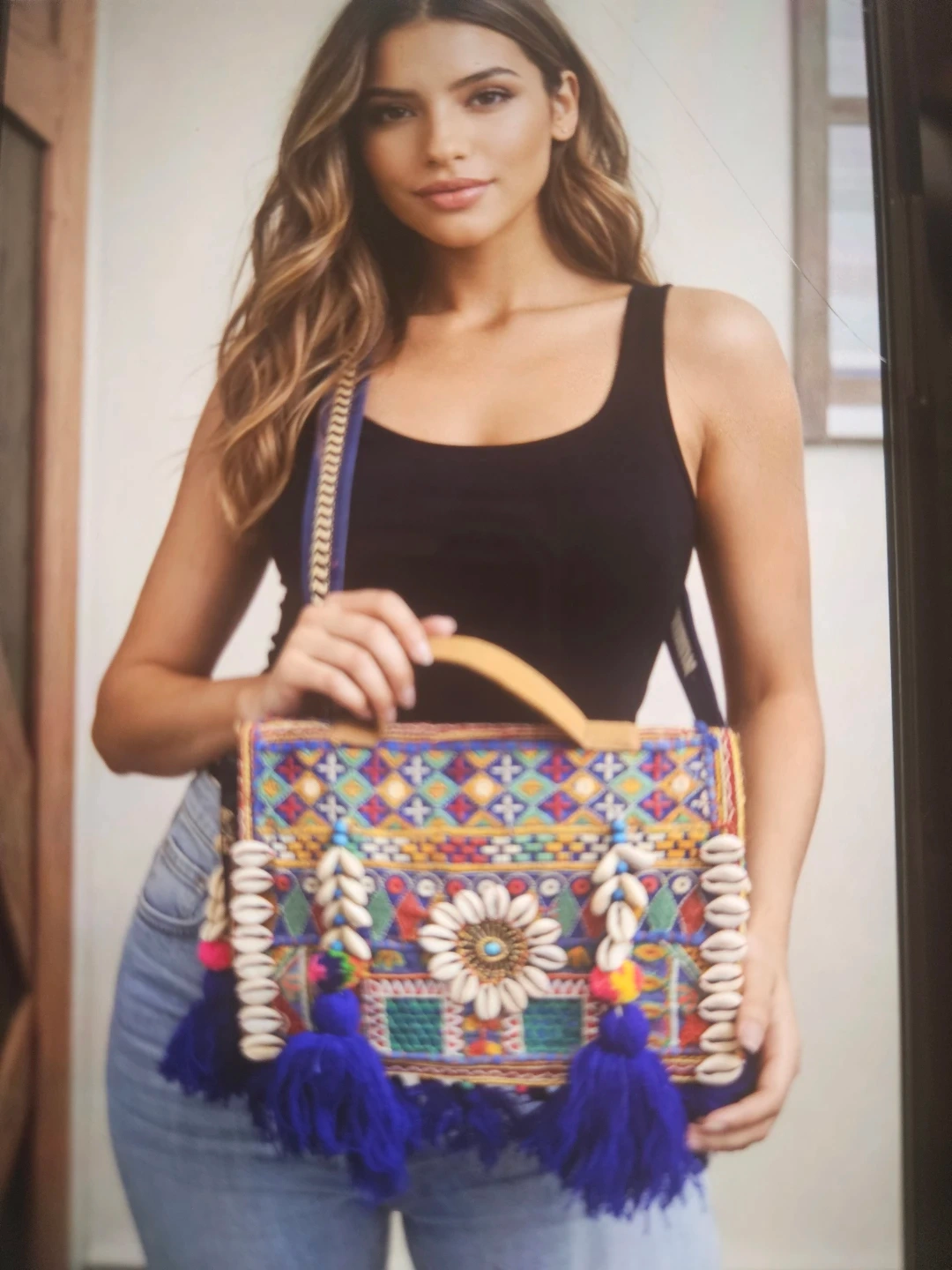 Embroidered Boho Shoulder Bag with Tassels and Shells