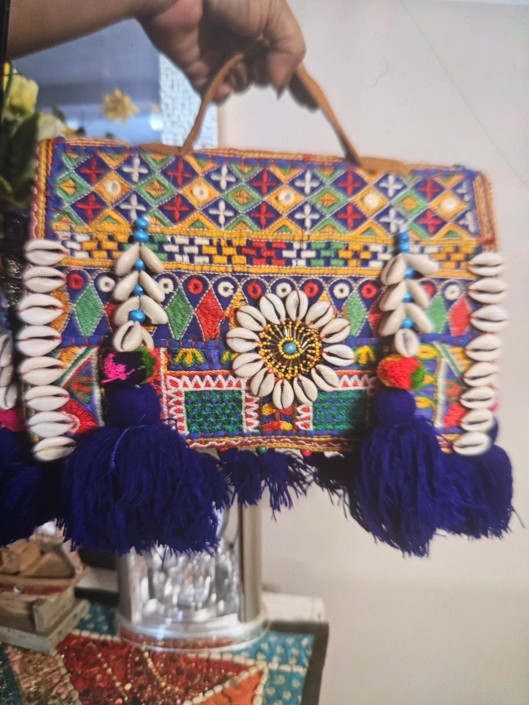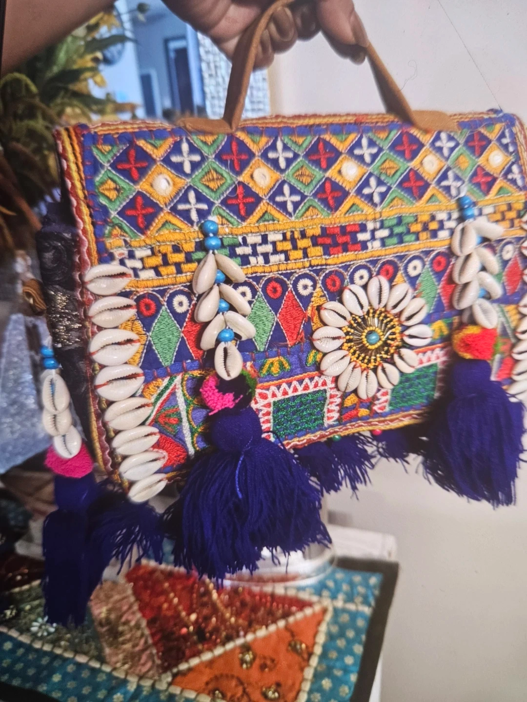 This vibrant shoulder bag features intricate embroidery with colourful patterns. It's adorned with tassels, seashells, and a central floral applique. The handles are made of tan leather.