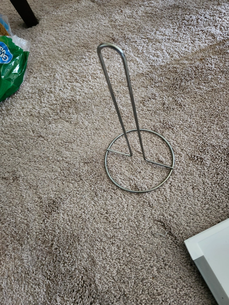 Metal paper towel holder. It has a stand to hold a roll of paper towels with a wire holder that can be adjusted to the size of your roll.
