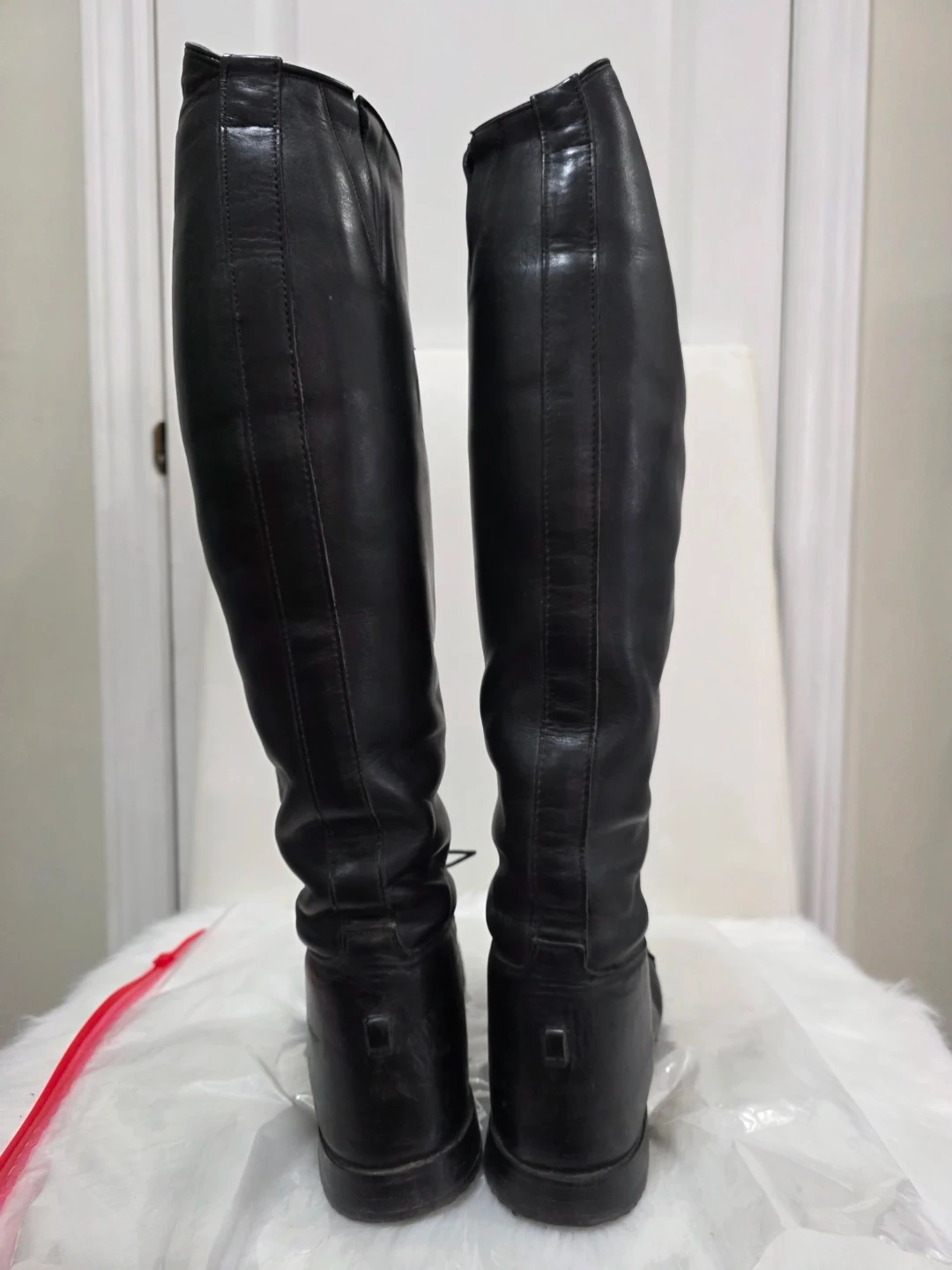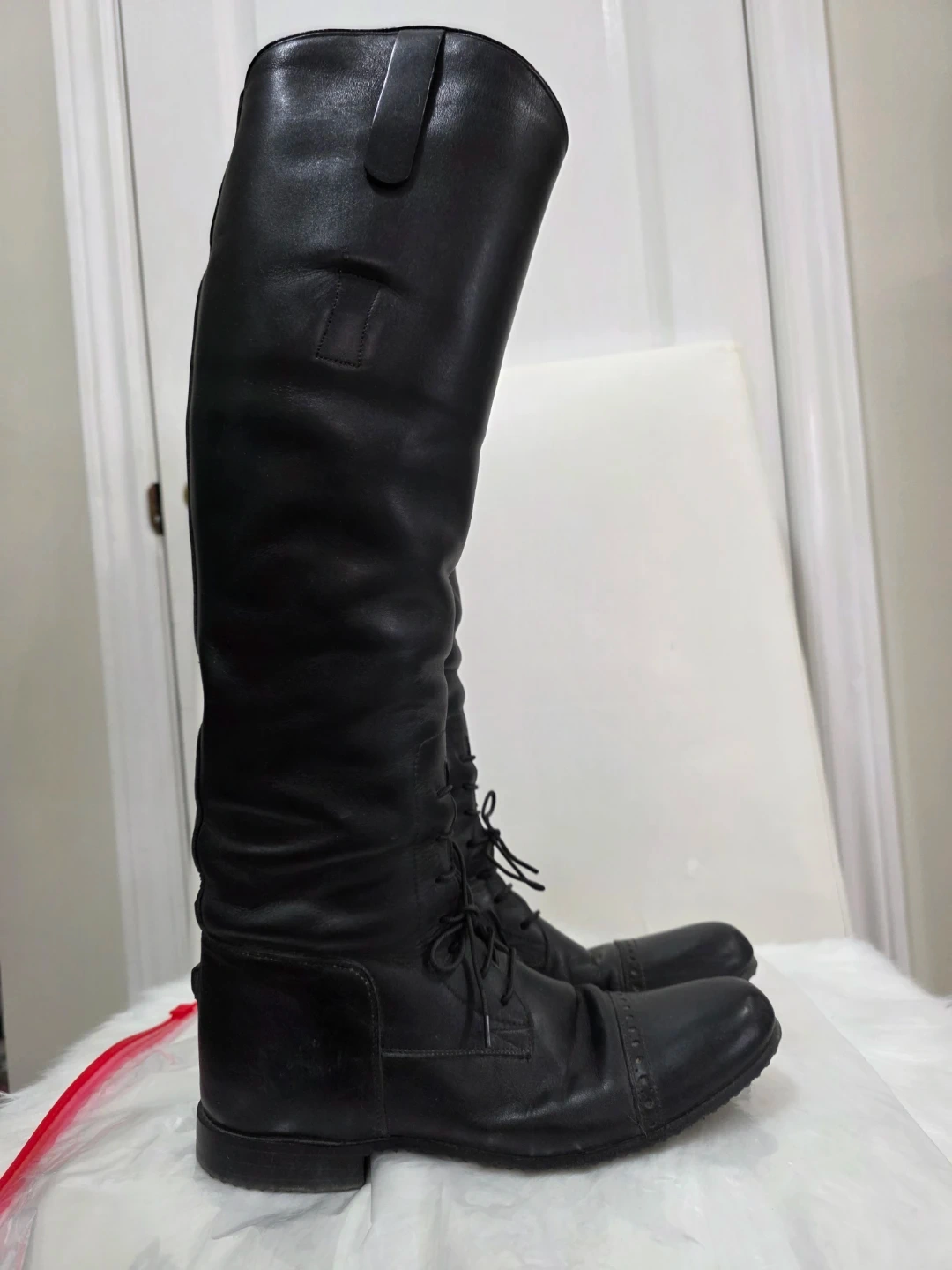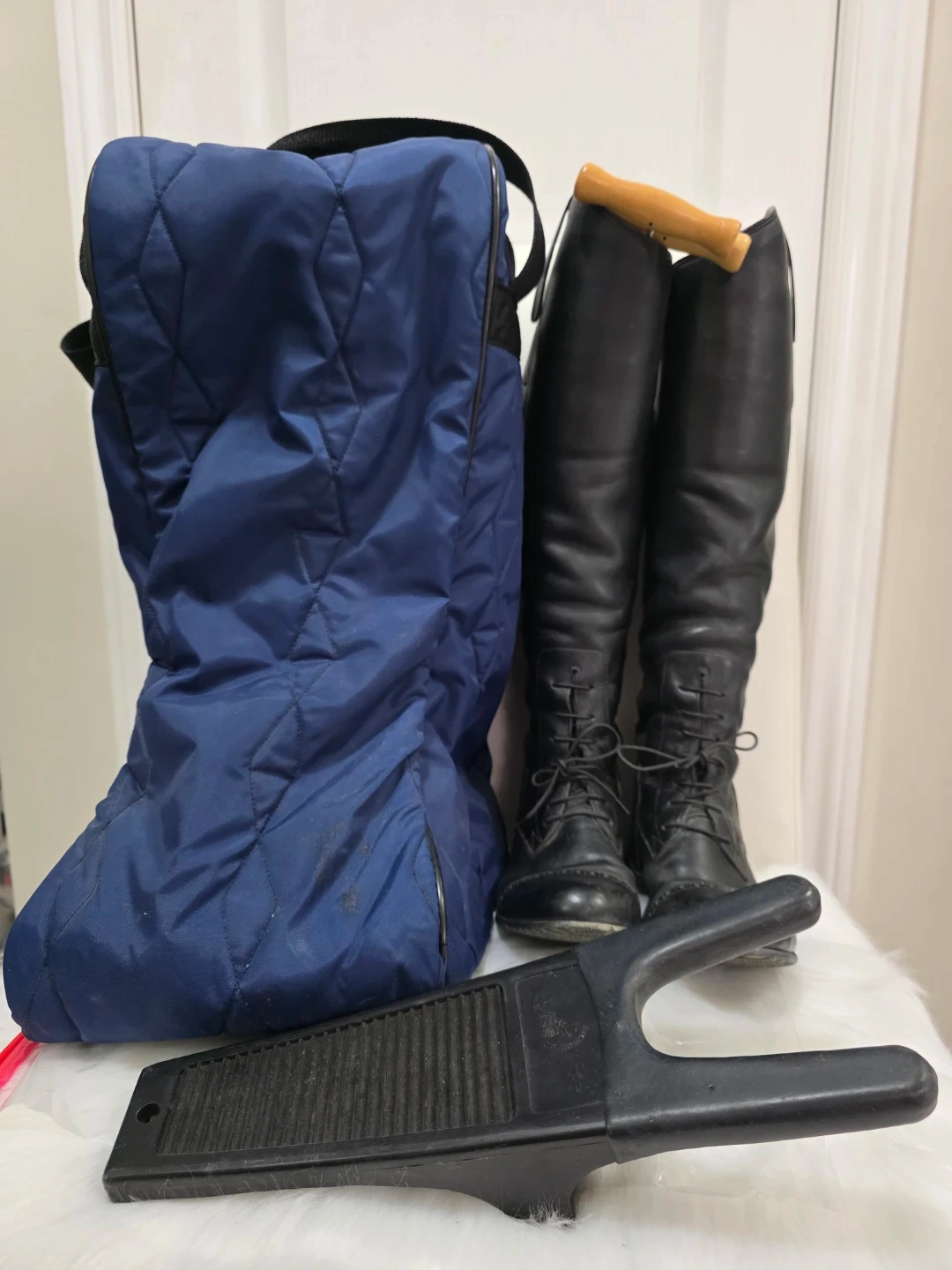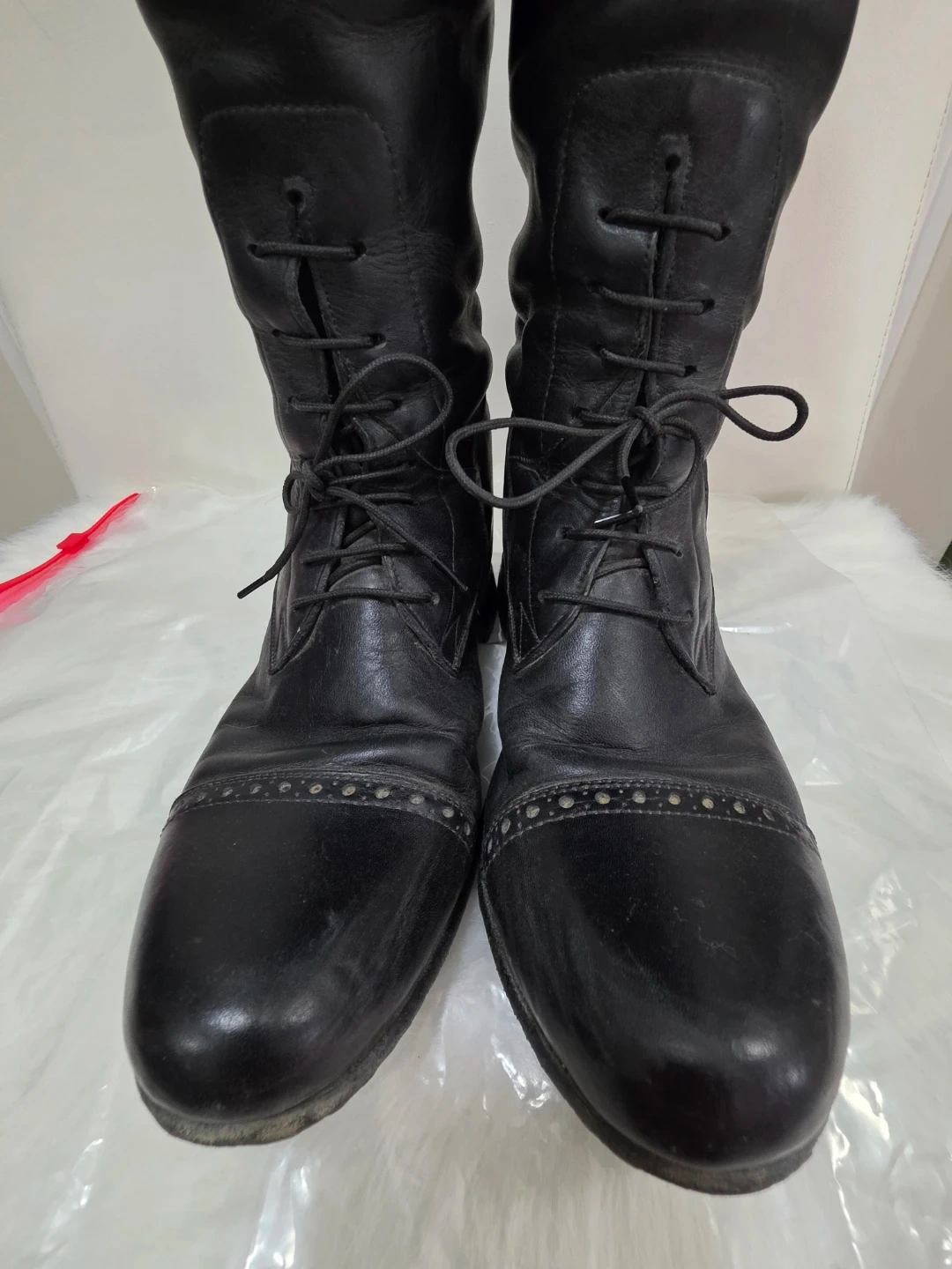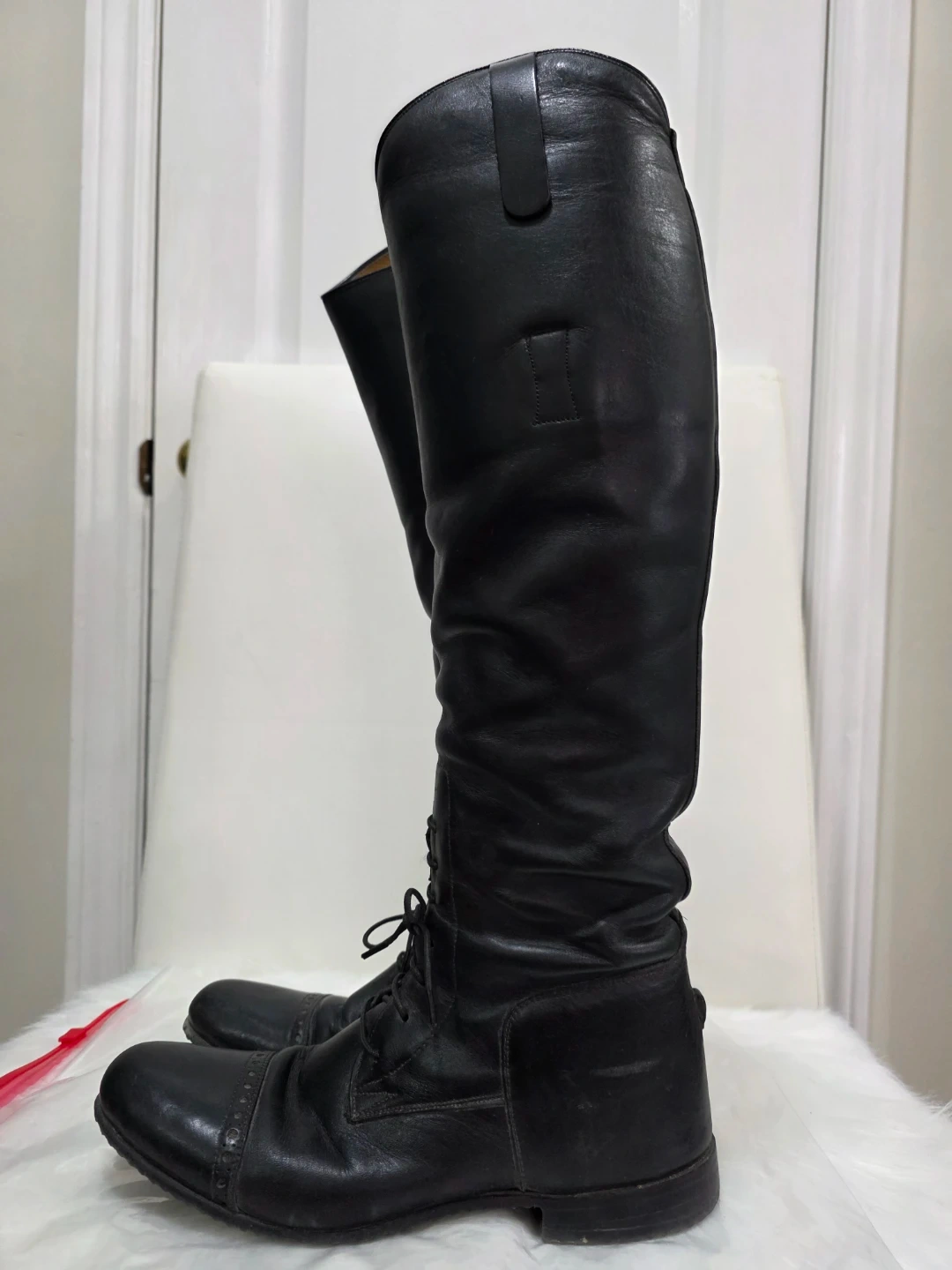 Black leather The Elite tall riding boots. These boots are made from leather with lace-up fronts, pull ups and rubber soles. Very comfortable. They're great for equestrian activities. Comes with blue boot bag, pulls and boot remover. All seen in pictures.