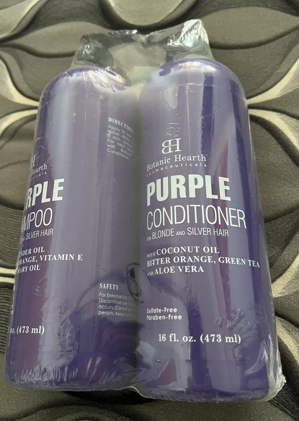 Biotanic Hearth Purple Shampoo and Conditioner set for blonde and silver hair. Each bottle is 16 fl. oz. (473 ml). Shampoo includes lavender oil, vitamin E, and rosemary oil. Conditioner contains coconut oil, bitter orange, green tea, and aloe vera. Both are sulfate-free and paraben-free.