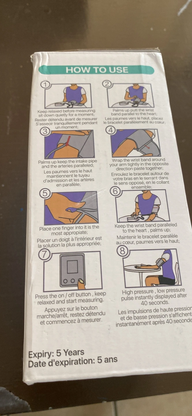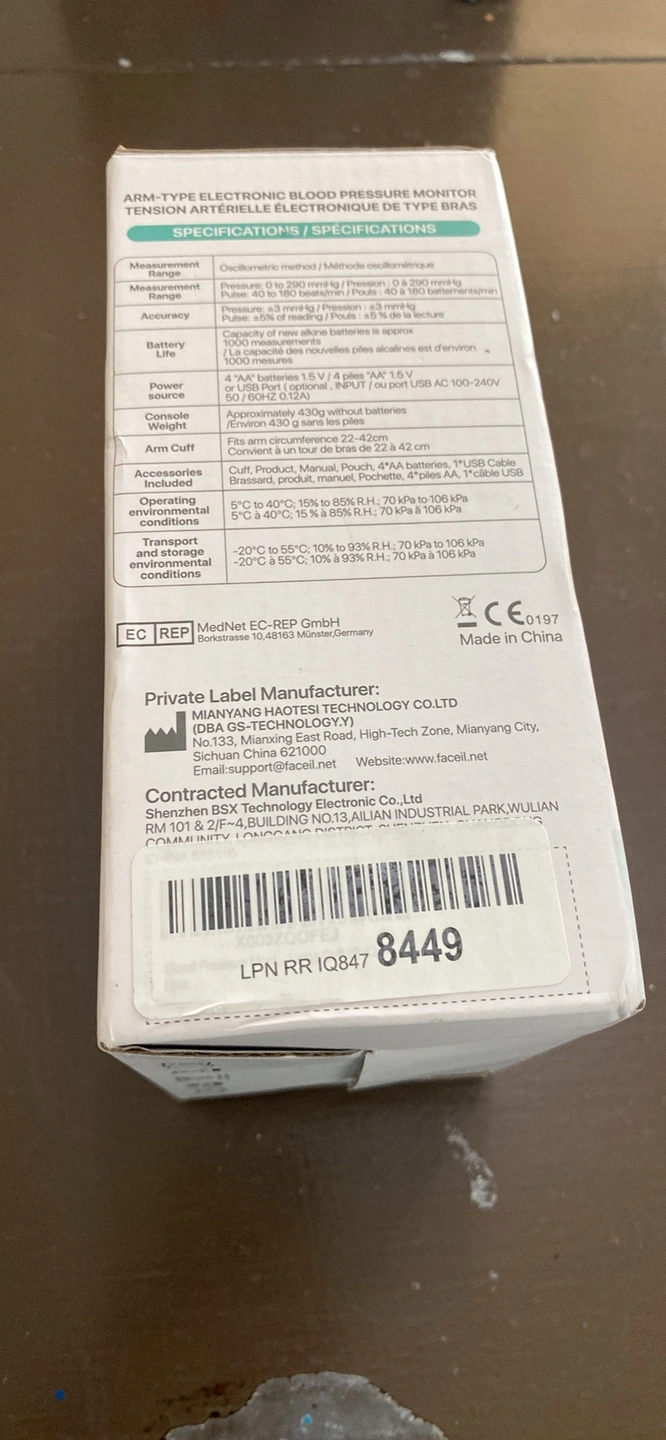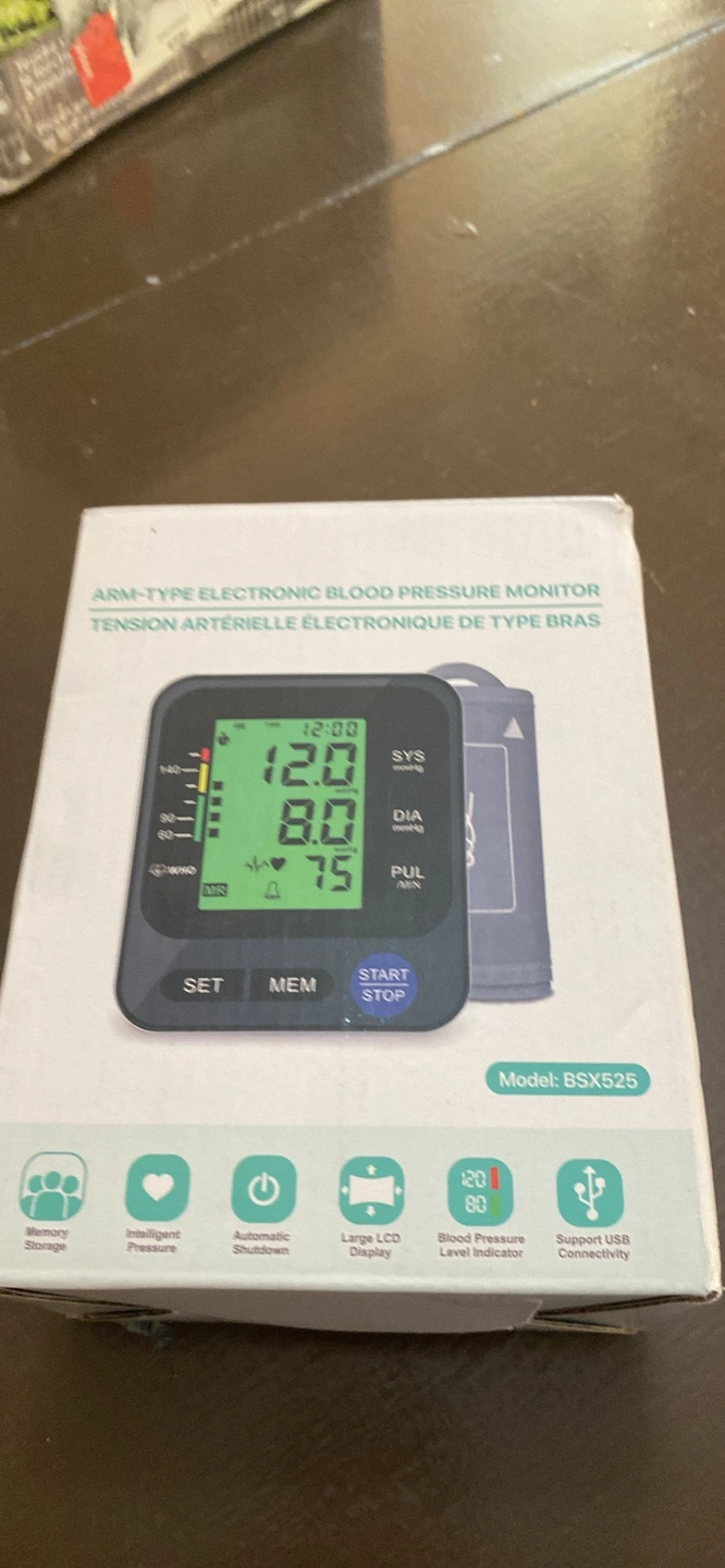 A brand new arm-type electronic blood pressure monitor. It features a large LCD display, memory storage, and USB connectivity. The monitor is easy to use and provides accurate readings.
