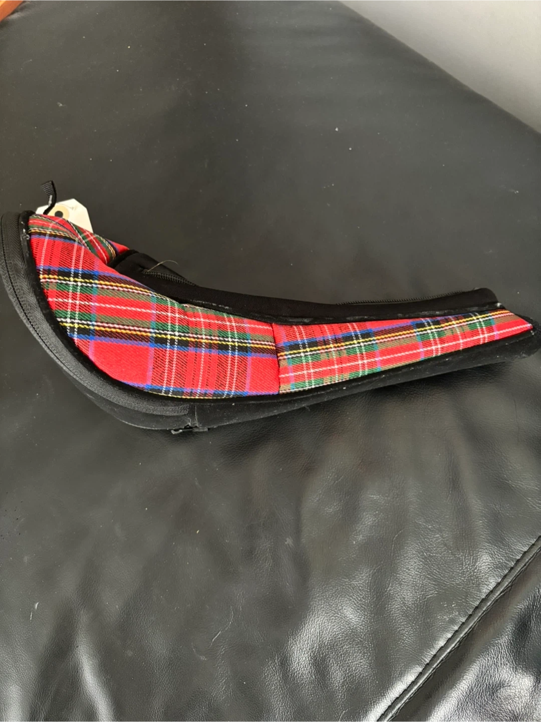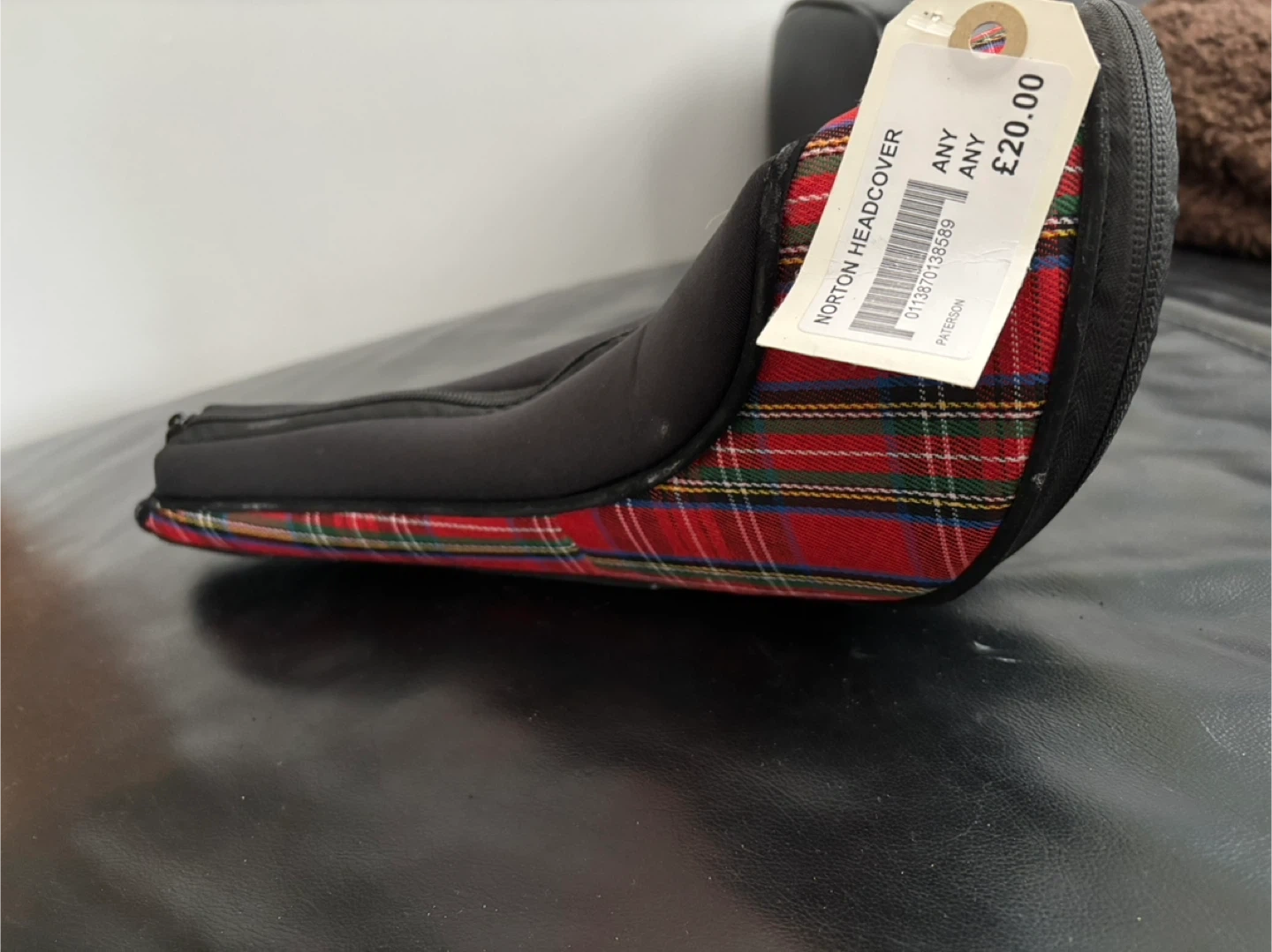 This is a golf headcover with the Old Course St Andrews logo embroidered on it. It features a classic red tartan plaid trim. It's made of durable material and offers protection for your golf club.