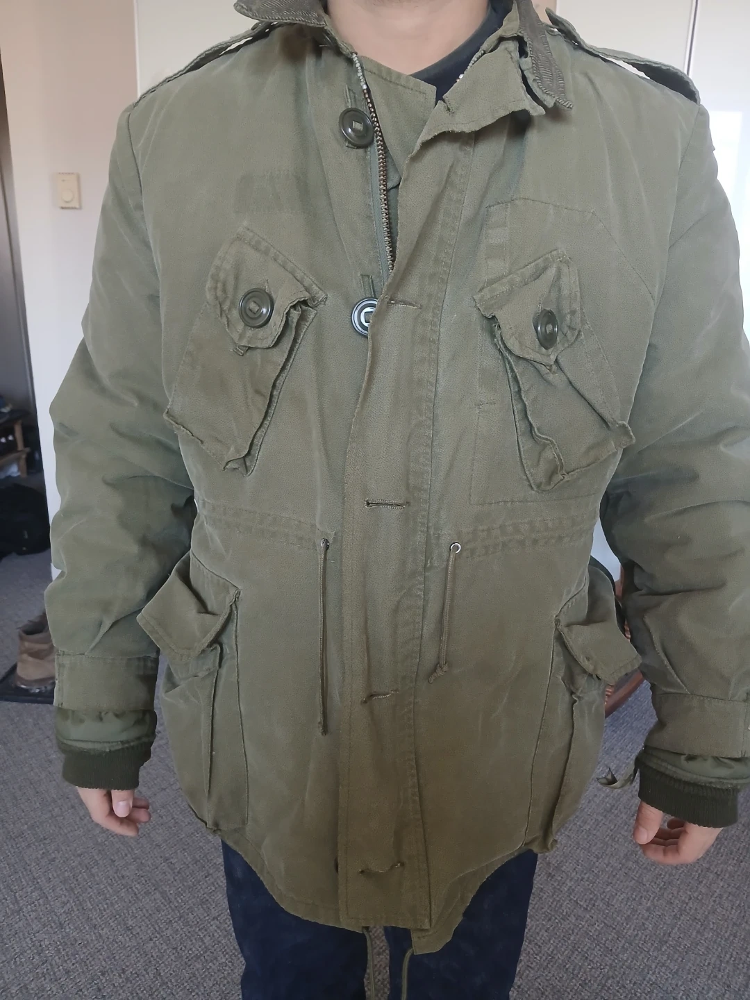 Olive green military-style parka jacket. Features a button-up front with a zip closure underneath. Multiple flap pockets on the front. Ribbed cuffs for warmth. Great for cold weather protection!