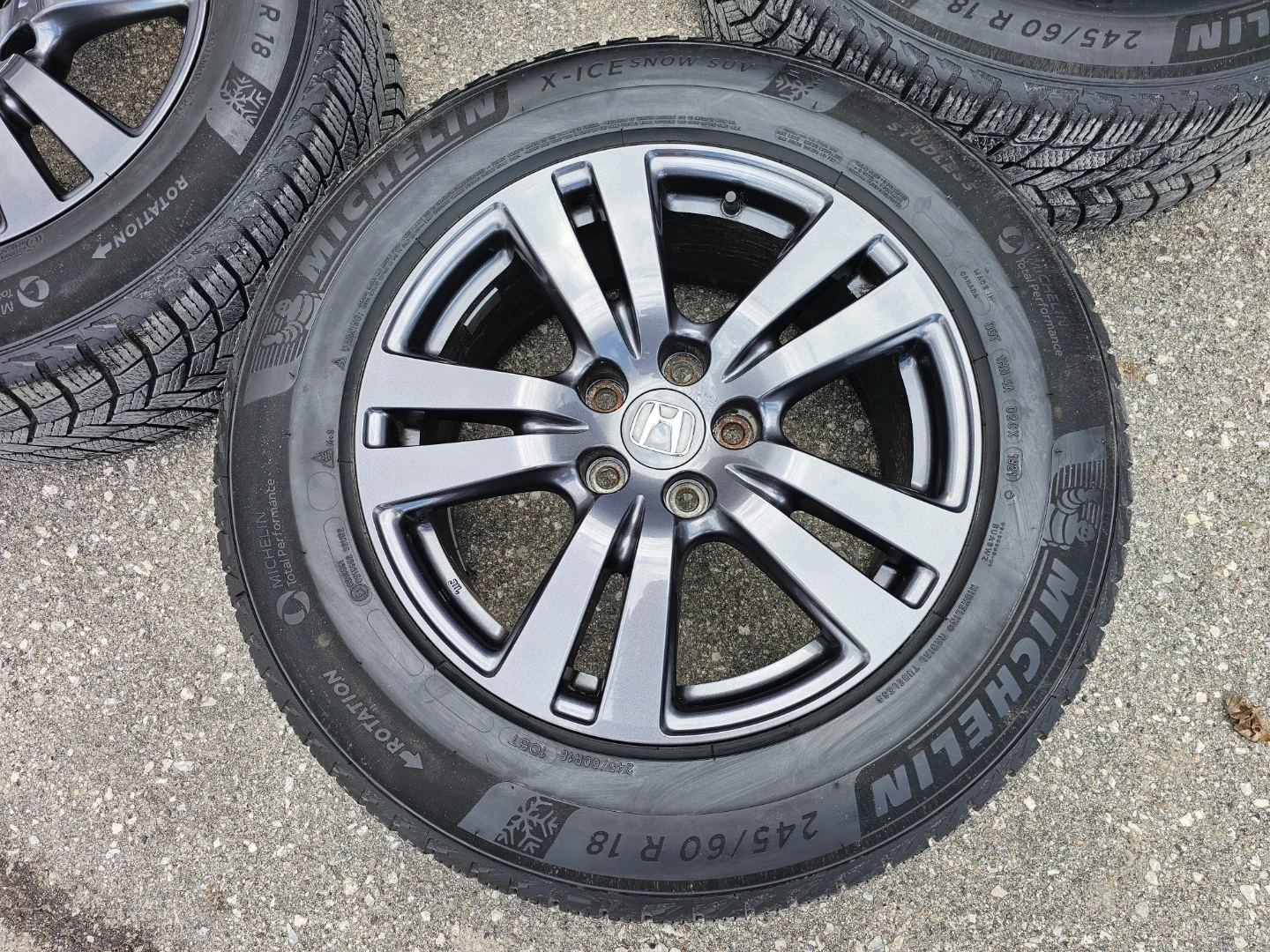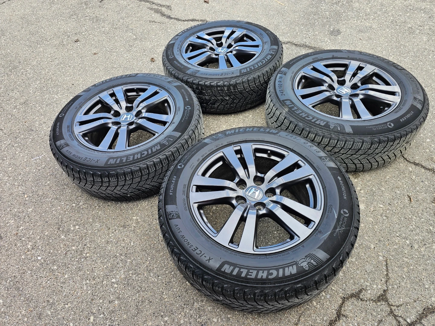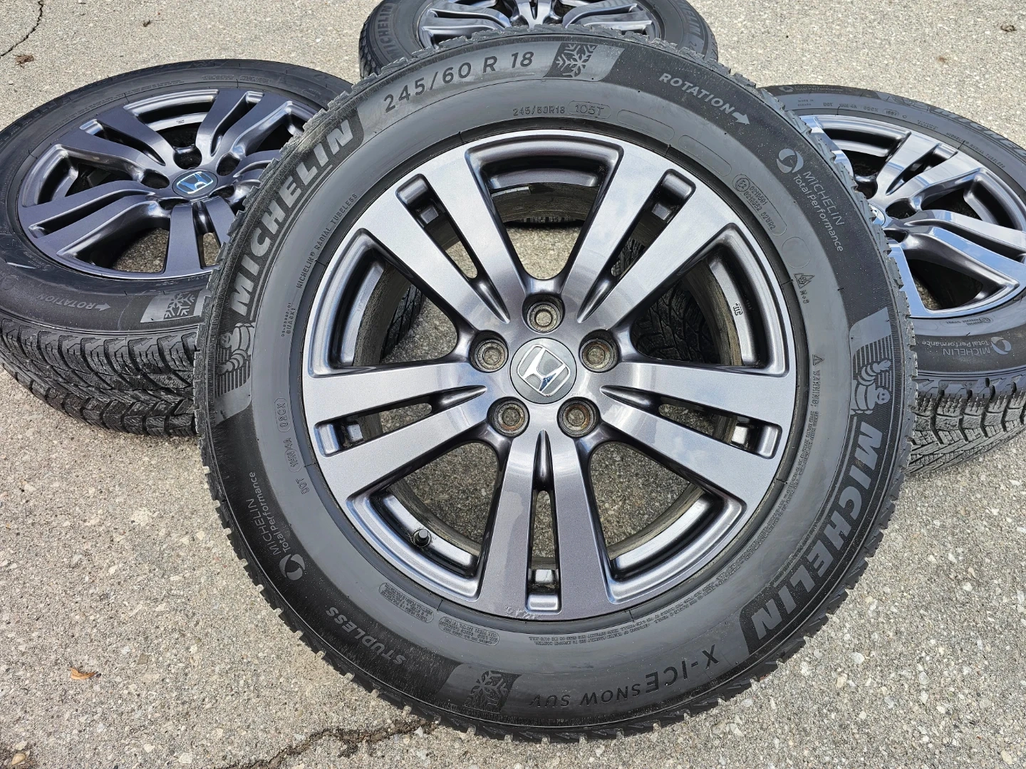 Set of 4 original 18" Honda pilot/passport rims and Michellin X-ICE winter tires 245/60 R18. Rims and tires are in good shape, no damage, no cracks, no bend. Lots of thread left on tires, TPMS installed
