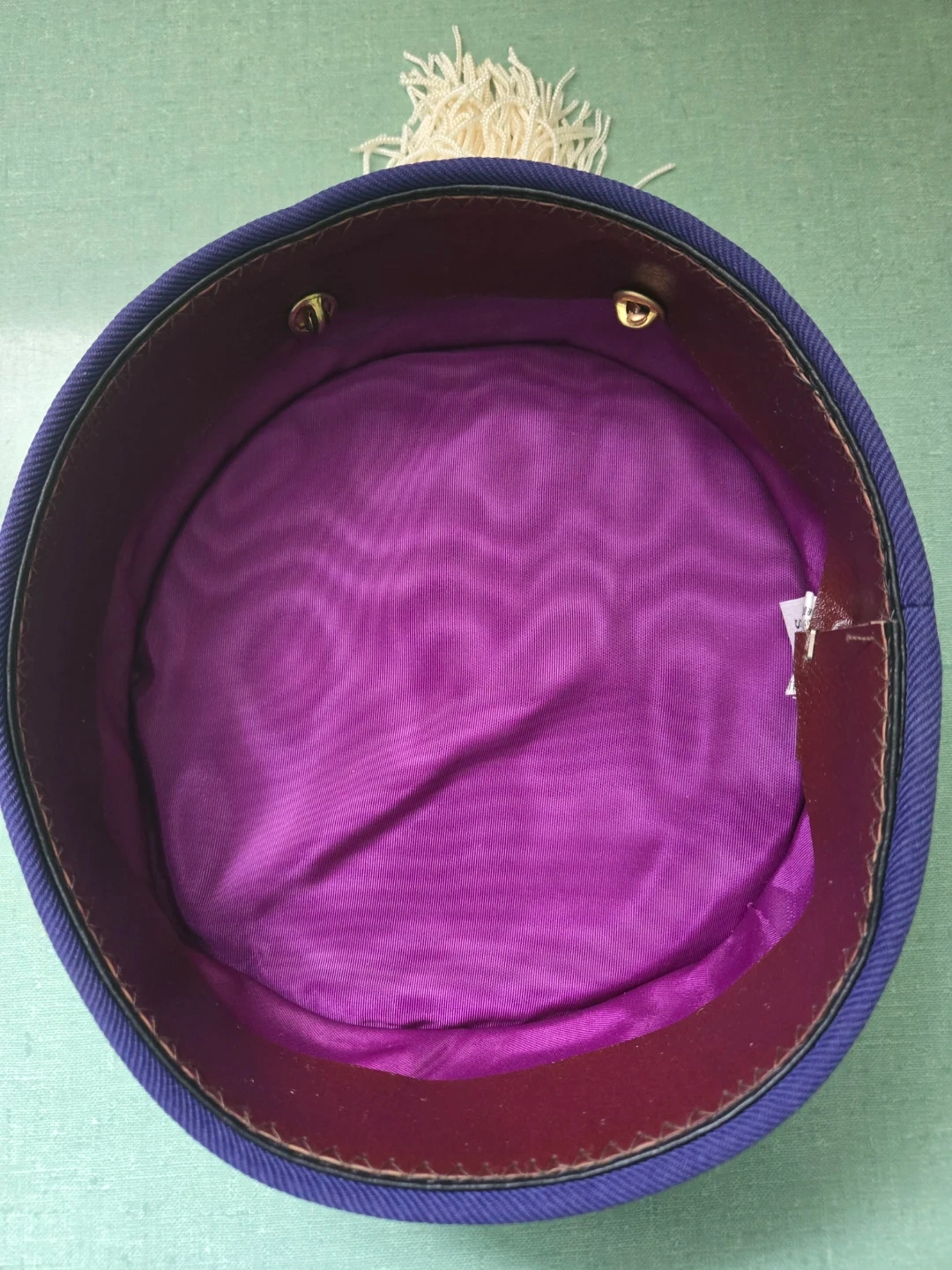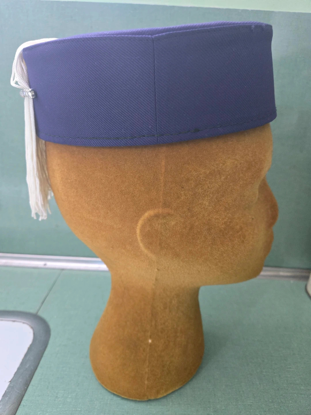 Navy with a white removable tassel fastened with a rhinestone clip