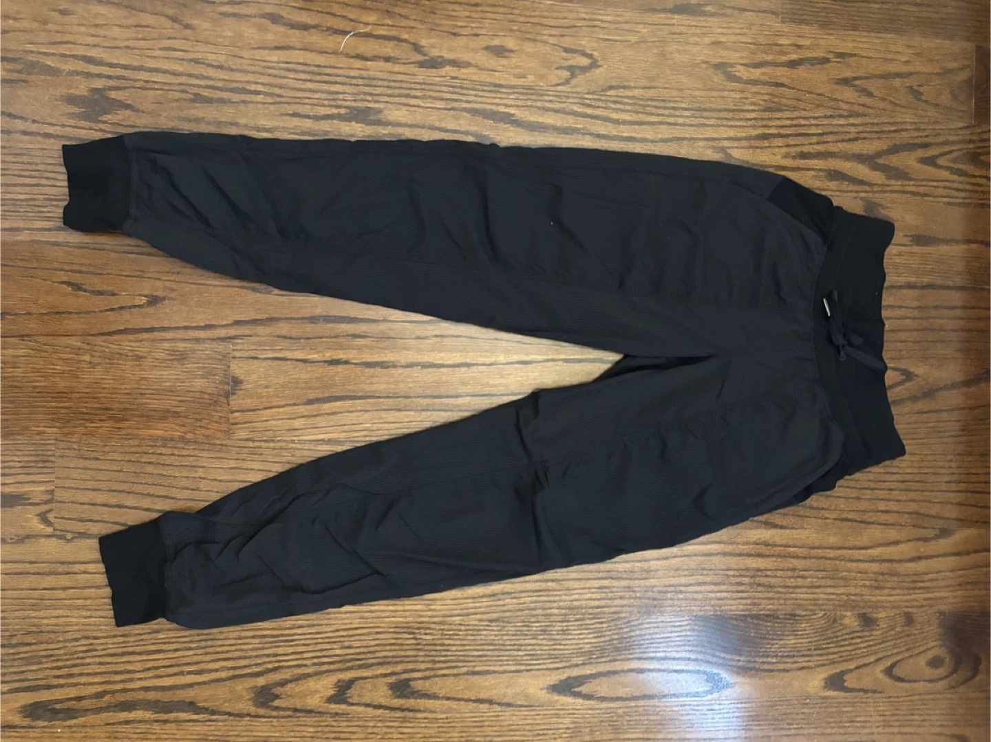 Comfortable Lululemon jogger pants in black. It's made from a lightweight, breathable fabric. Perfect for workouts or casual wear!