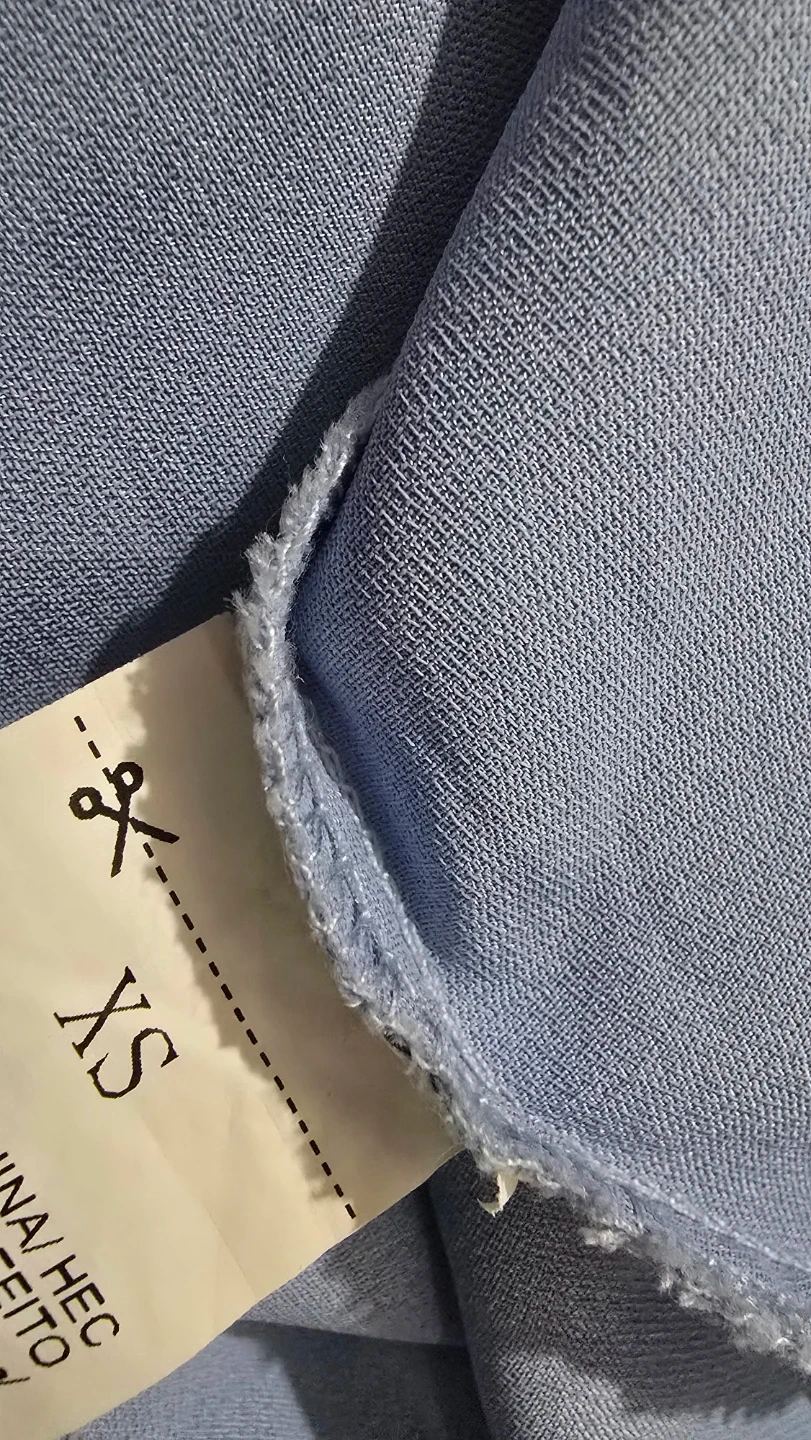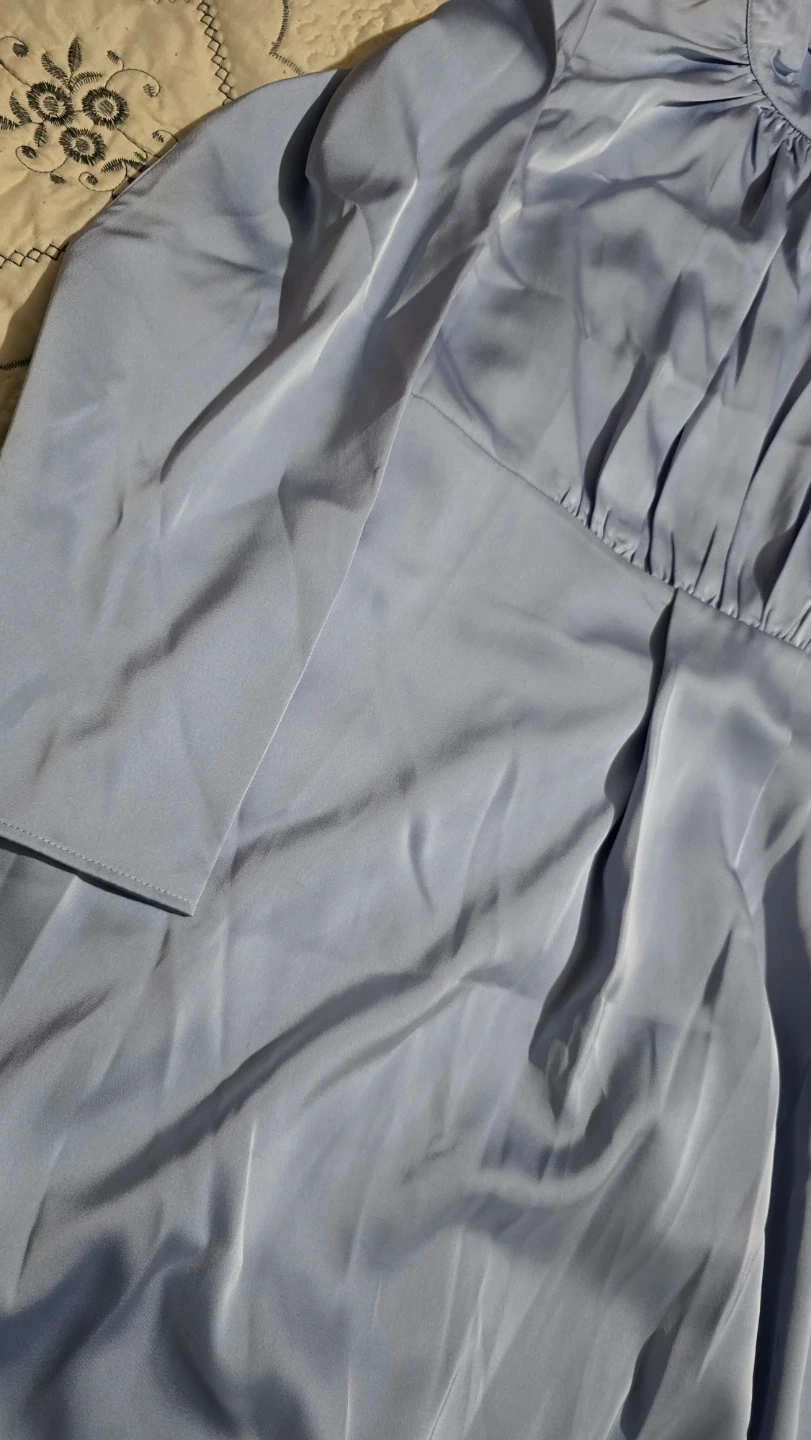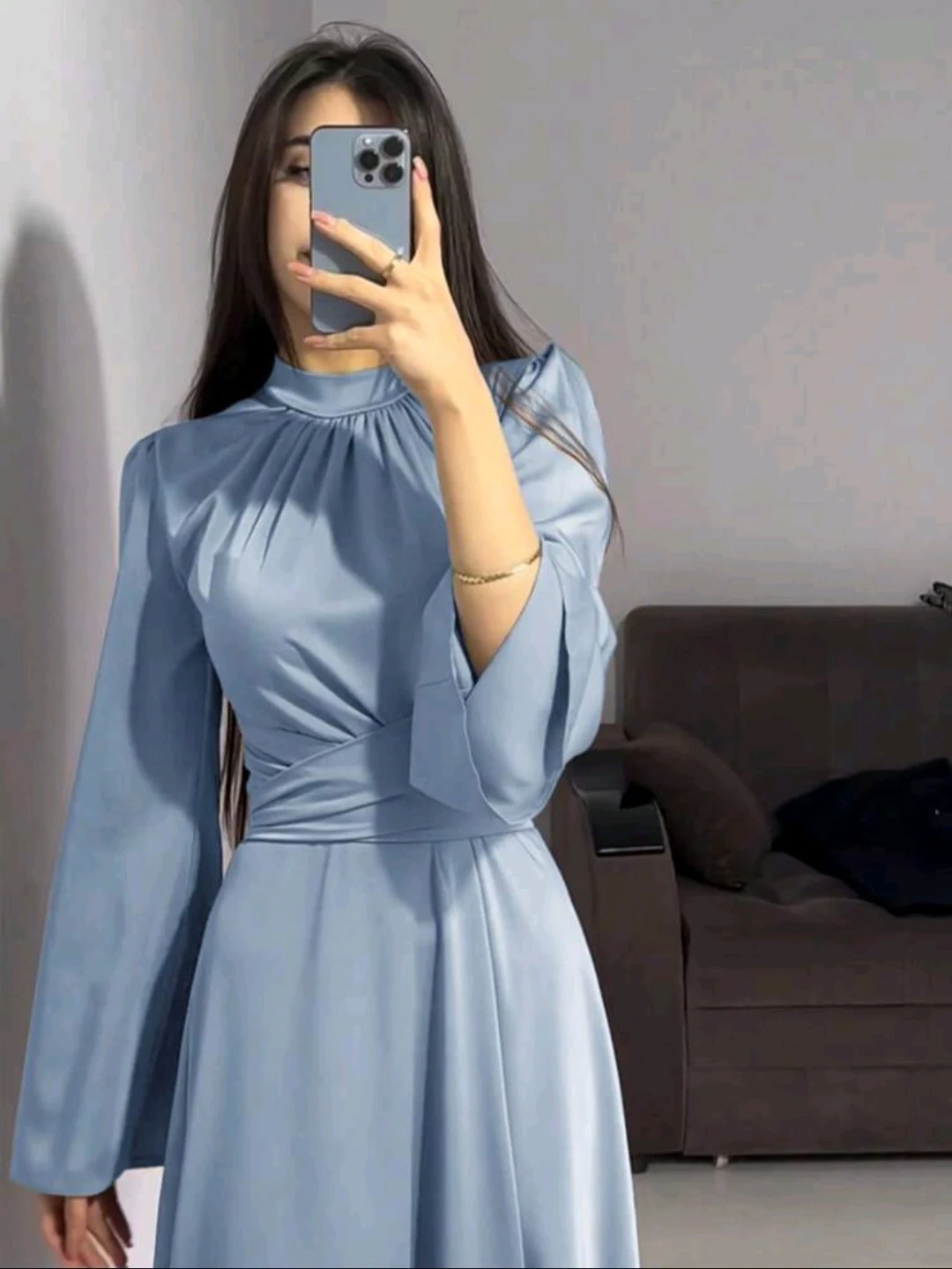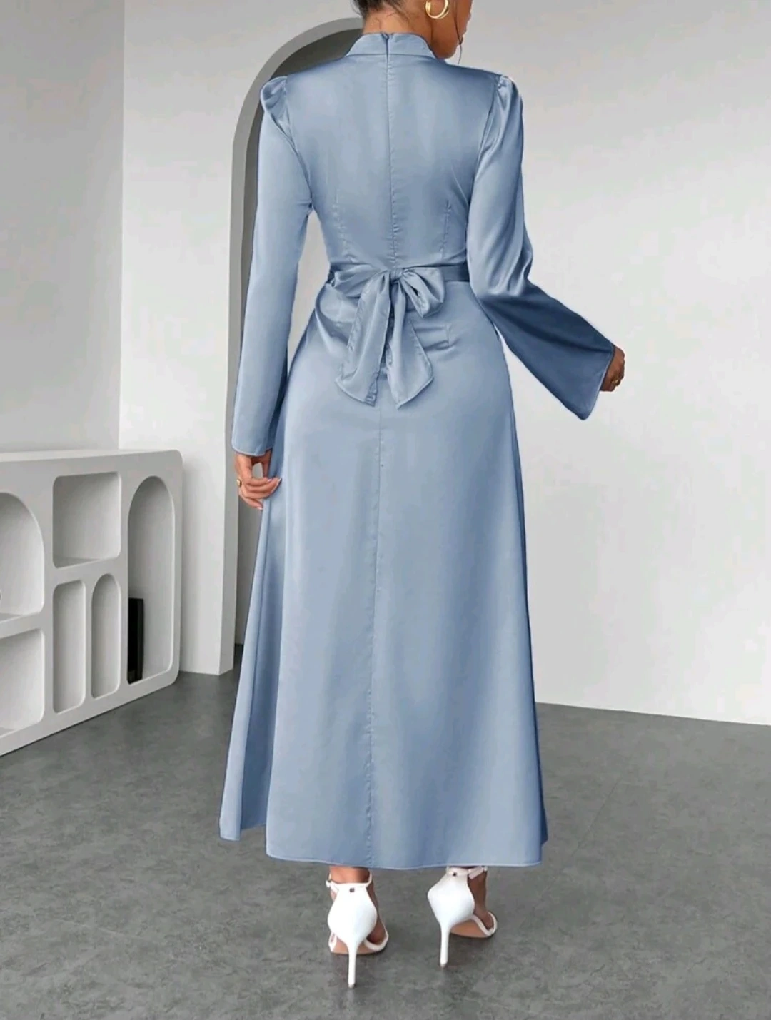 This elegant blue dress features a satin-like material with a flattering ruched neckline and a tie-back waist. It has long bell sleeves and a flowy A-line skirt. It's suitable for a dressy occasion or a sophisticated look.