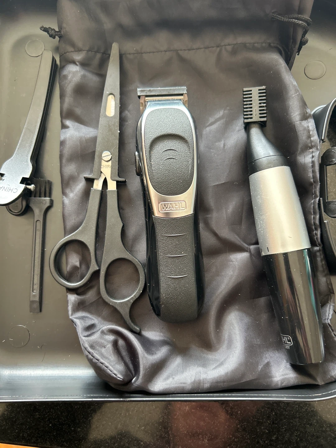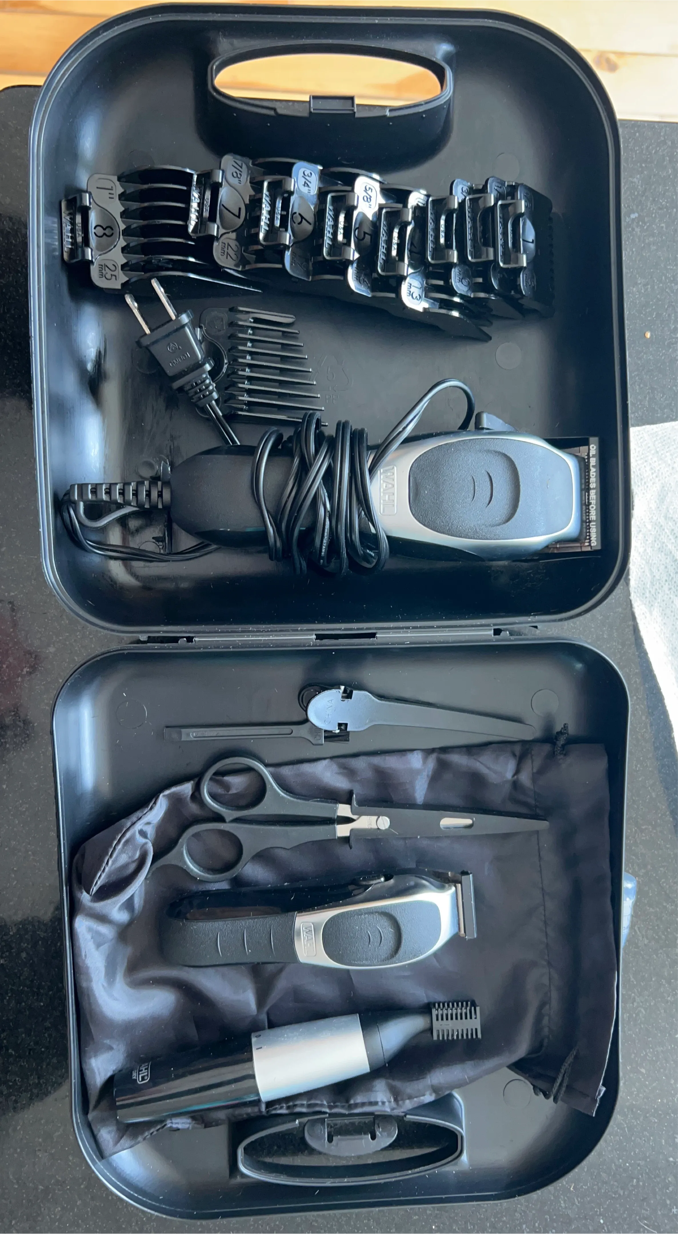 This WAHL grooming kit includes a corded hair clipper and a cordless trimmer. It comes with various attachment combs for different hair lengths, scissors, and a cleaning brush. Everything is neatly stored in a durable black carrying case.