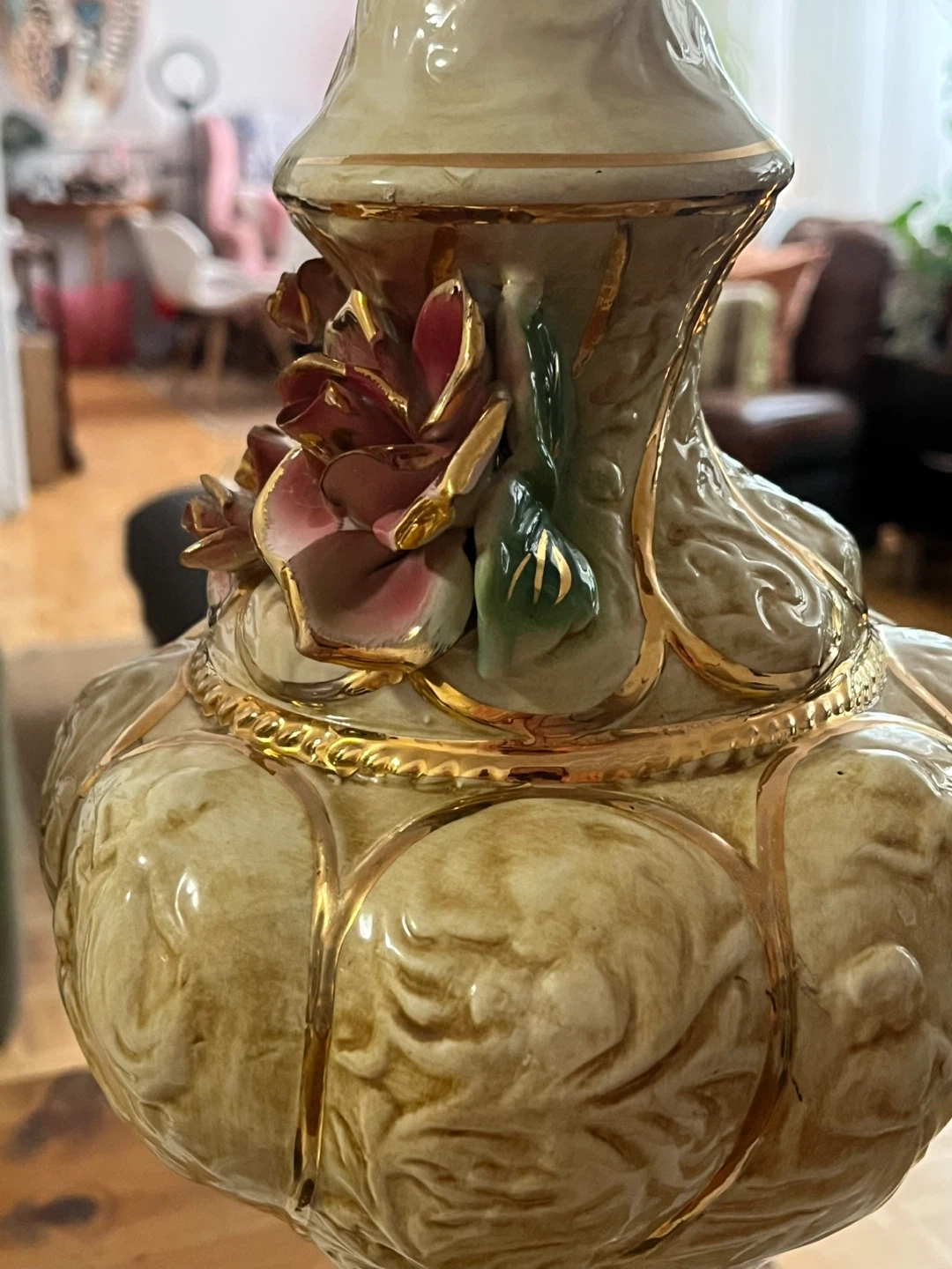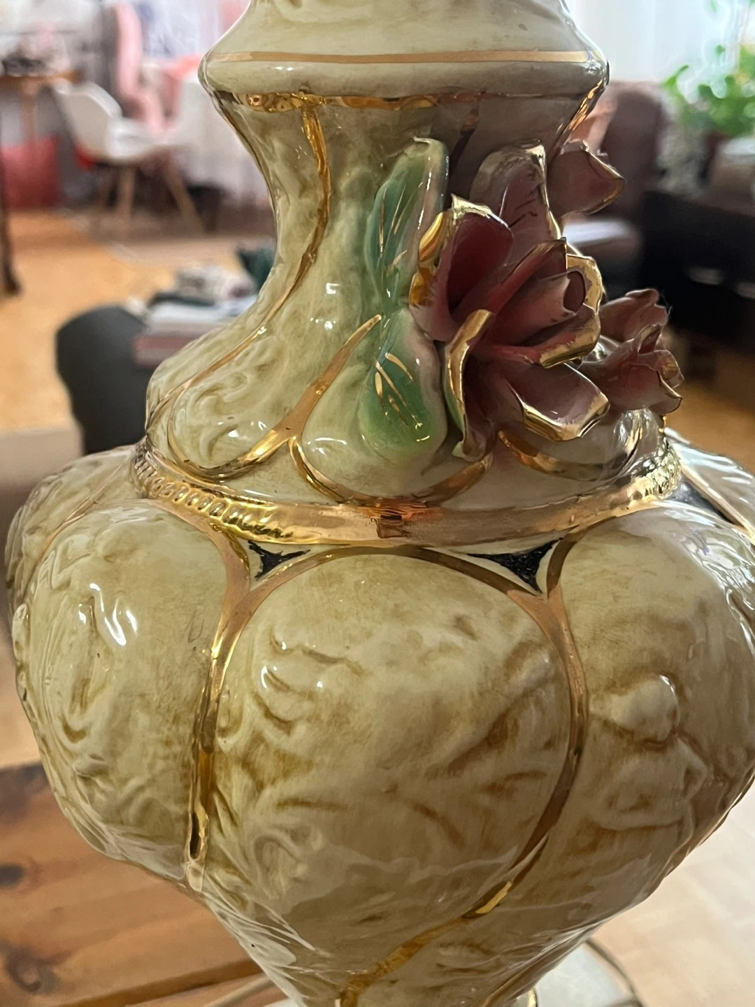 Selling a beautiful set of two antique Capodimonte style table lamps featuring detailed porcelain roses. These are classic Italian-style decorative lamps and make a stunning statement in a living room, bedroom, or traditional space.
