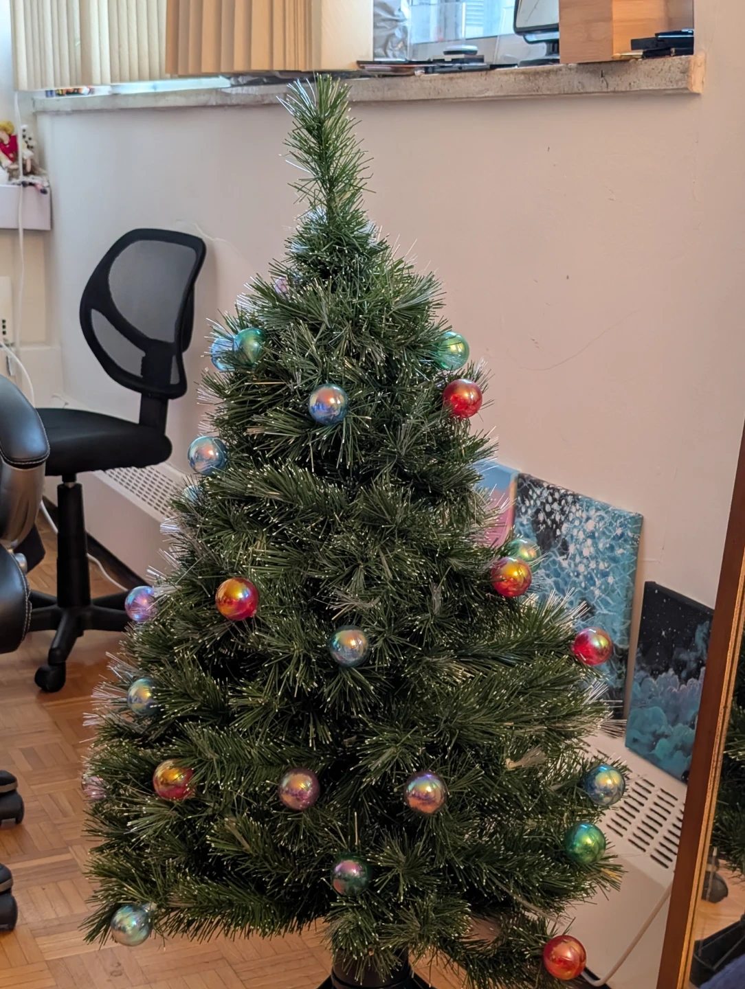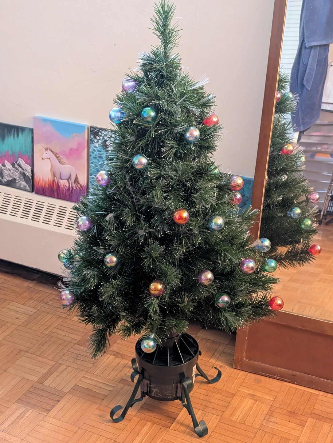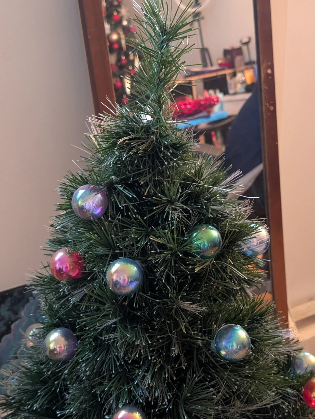 This is a pre-lit artificial Christmas tree. It comes with colourful iridescent ornaments. It's perfect for a small space or as a secondary tree for holiday decorations!