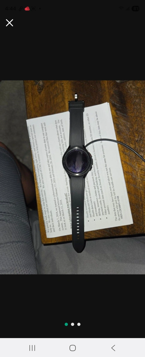 Smartwatch with a black band. The watch has a round face. Included is a charging cable and charging puck. This would be a perfect item to keep track of your fitness and wellness goals.