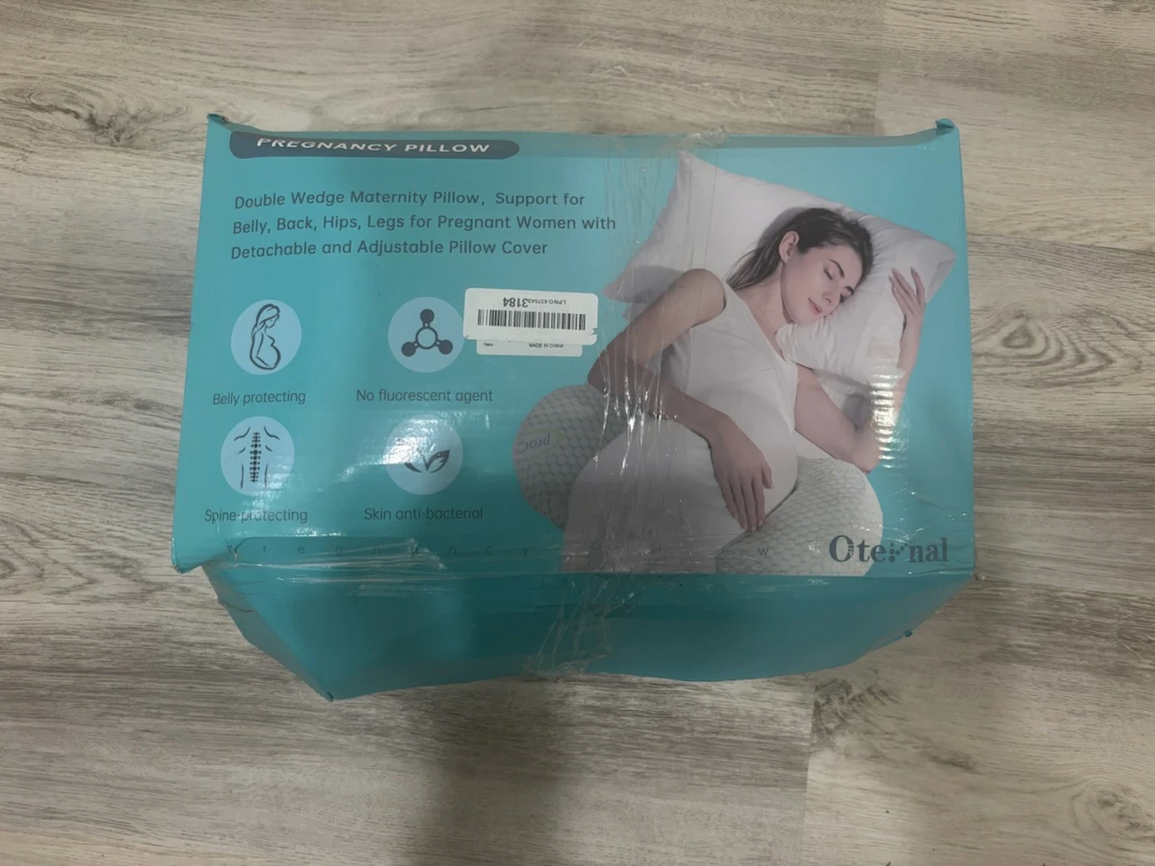 This double wedge maternity pillow supports belly, back, hips, and legs. It features a detachable and adjustable pillow cover. It is designed for pregnant women and is belly and spine protecting. No fluorescent agent is used.