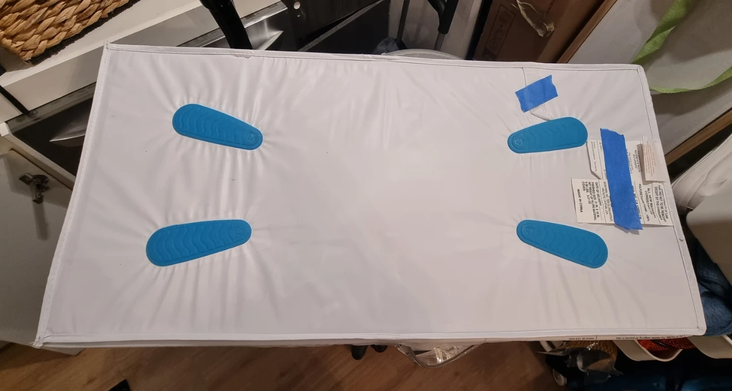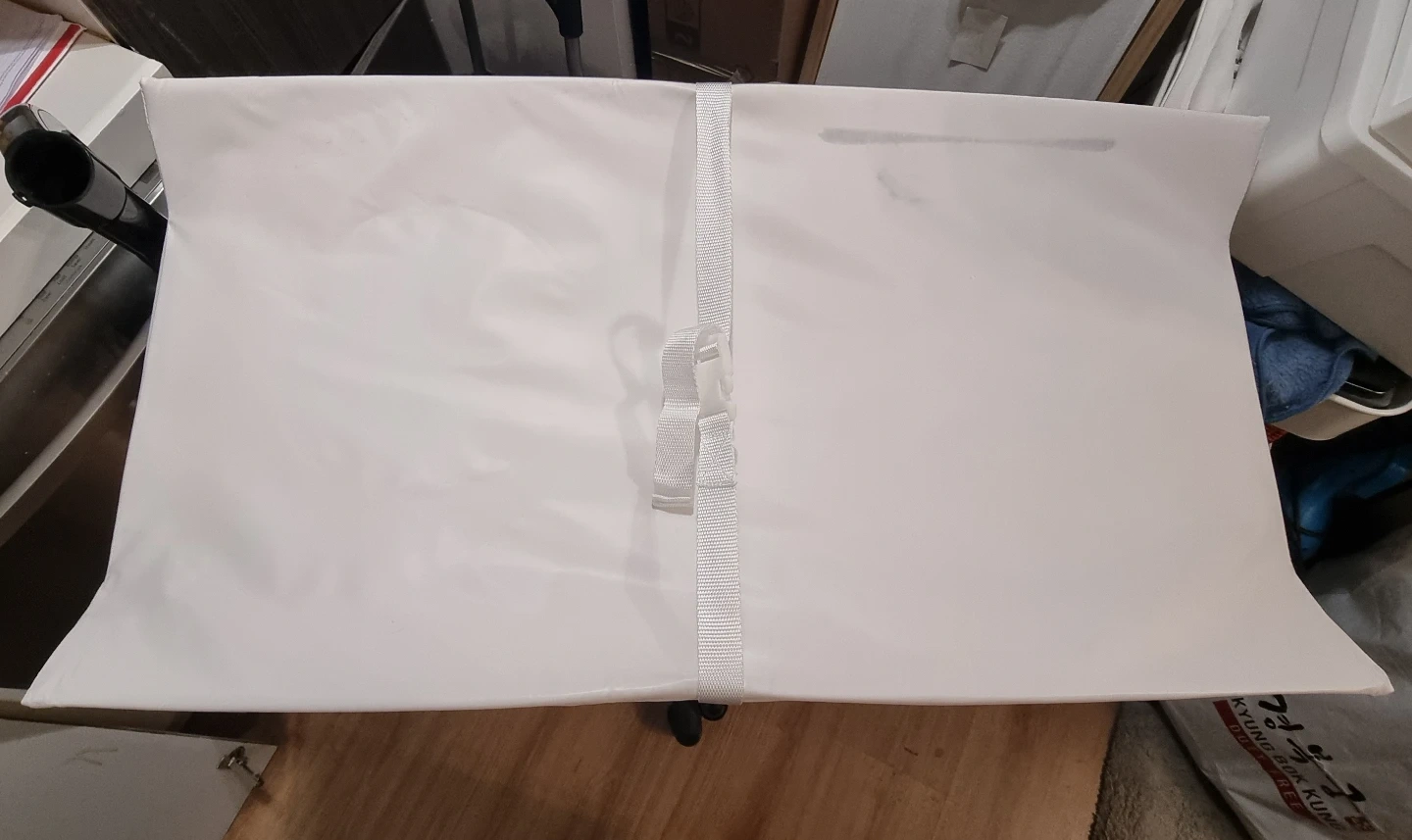 This is a white baby changing pad. It's made of a wipeable material and has four blue non-slip pads on the bottom. It also comes with safety straps to keep your baby secure. Useful for changing diapers at home or on the go!
