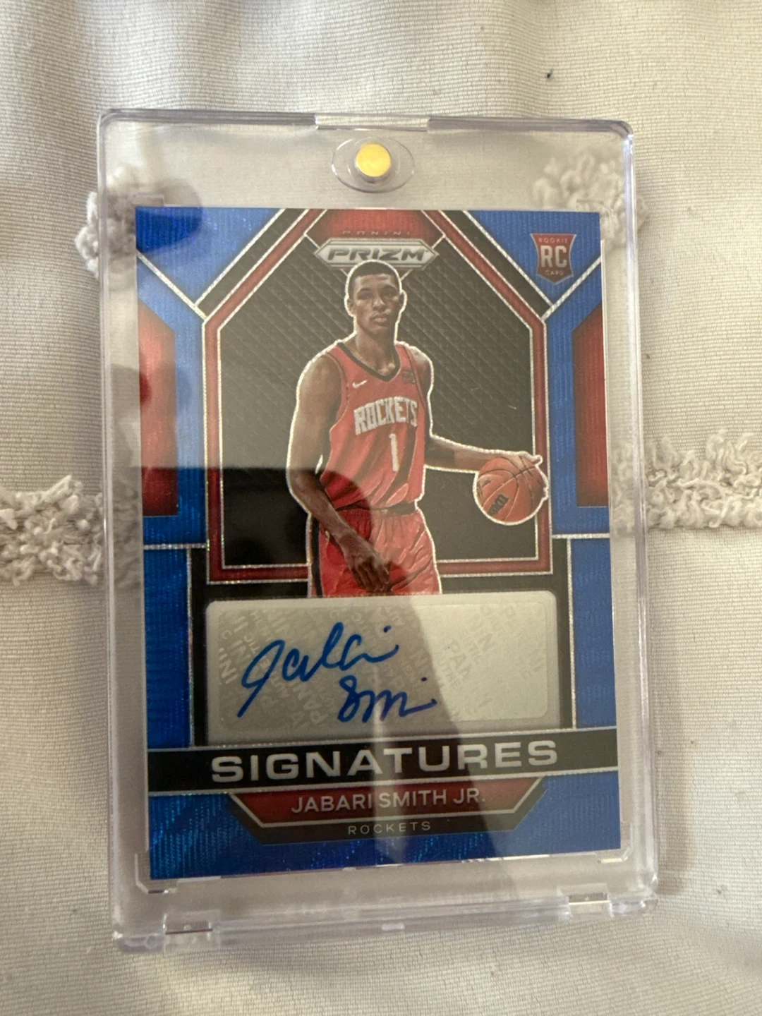 This is a 2022-23 Panini Prizm basketball card featuring Jabari Smith Jr. of the Houston Rockets. The card is autographed and guaranteed by Panini America, Inc. It's part of the 2022-23 Panini Prizm Basketball set. This card is a great addition for any collector!