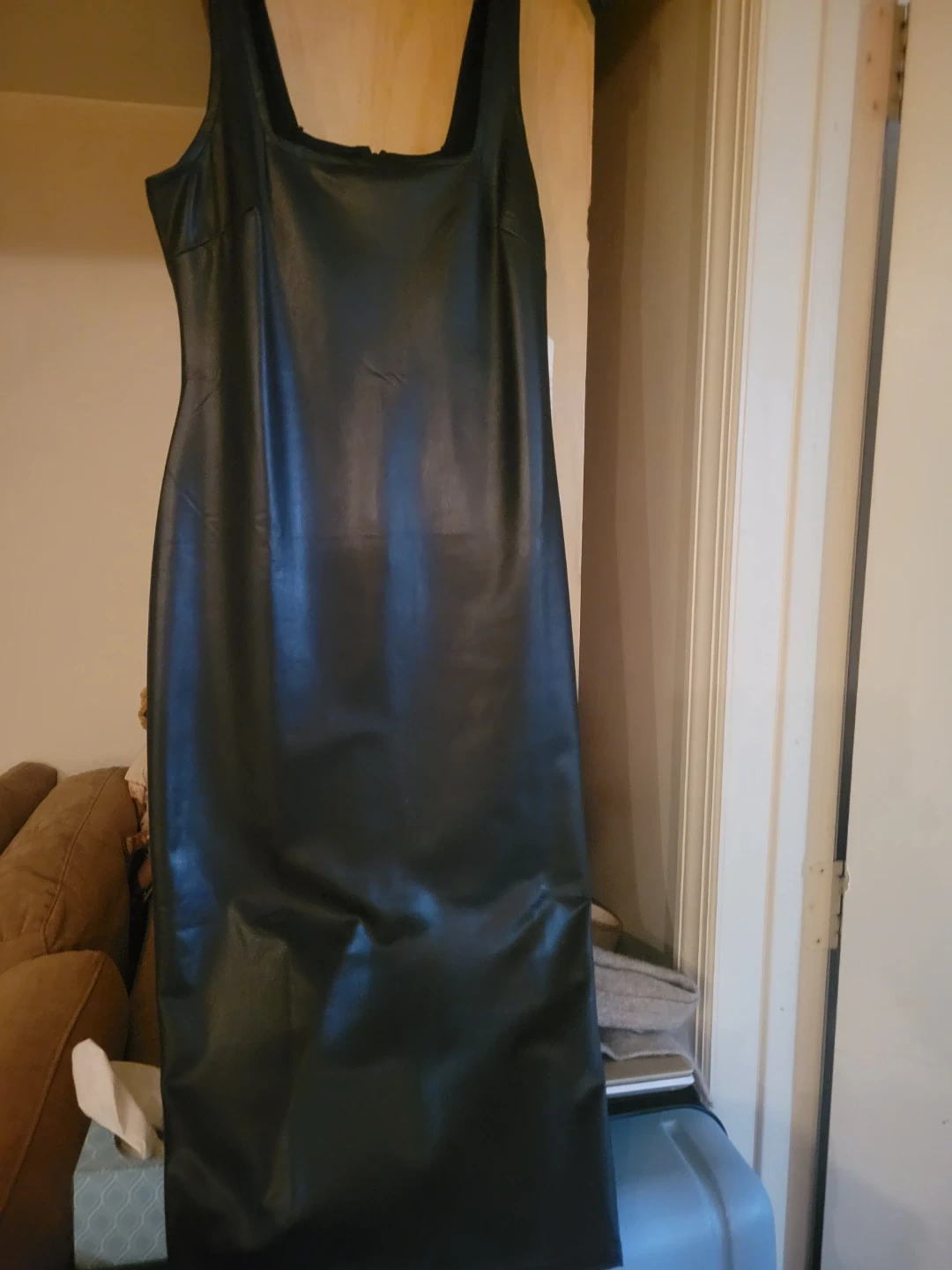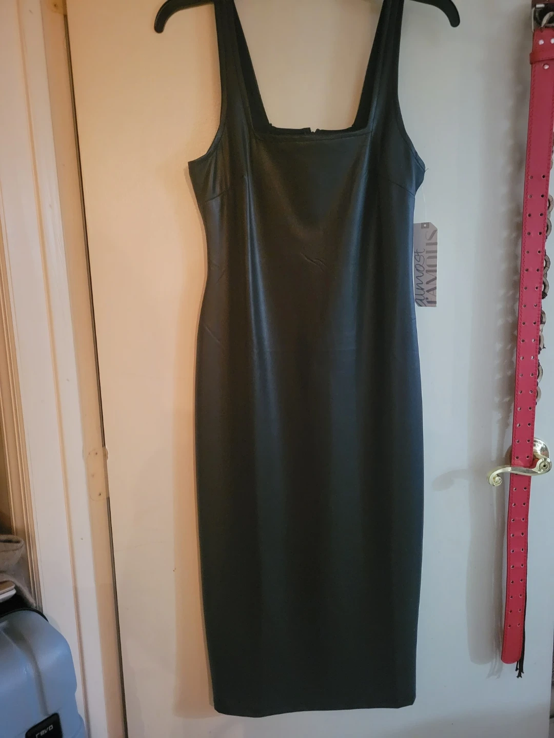 This new with tag black midi dress is made from faux leather. It features a flattering square neckline and a sleeveless design. Zipper closure in the back with a slit.