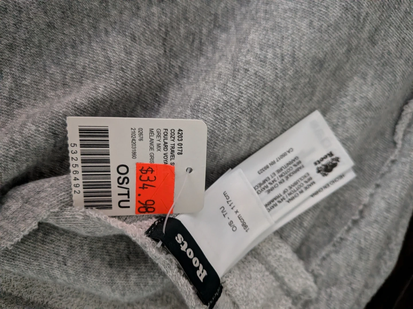 New with tags Roots Cozy Travel Scarf in Grey Mix. Made of 90% cotton and 10% rayon. Measures 198cm x 117cm. Great for travelling or keeping cozy!