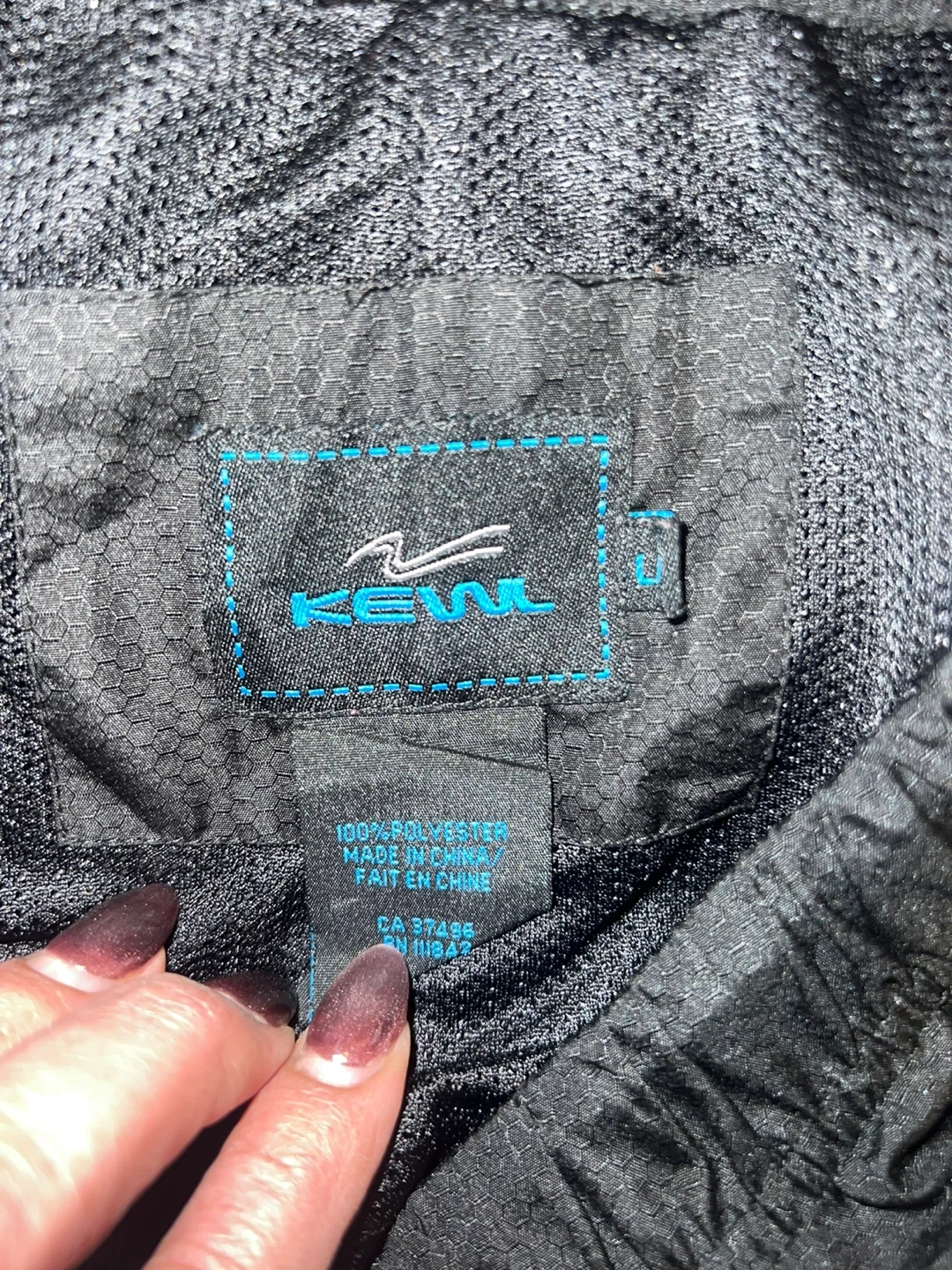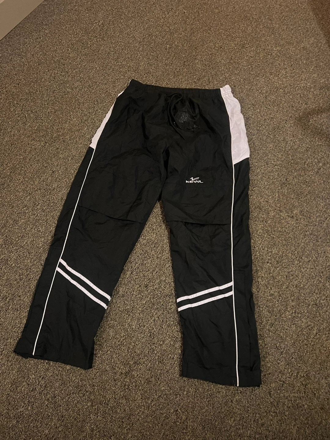 Kewl brand black track pants made from 100% polyester. These pants are size large and feature white stripe accents. They have an elastic waistband with a drawstring for a secure fit. Waterproof