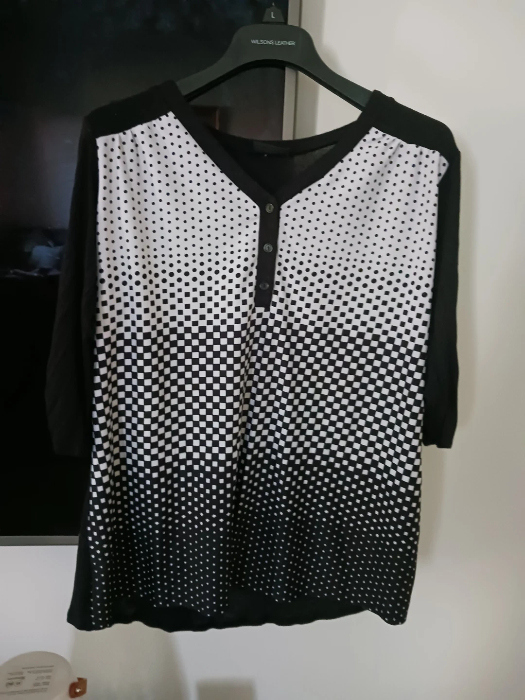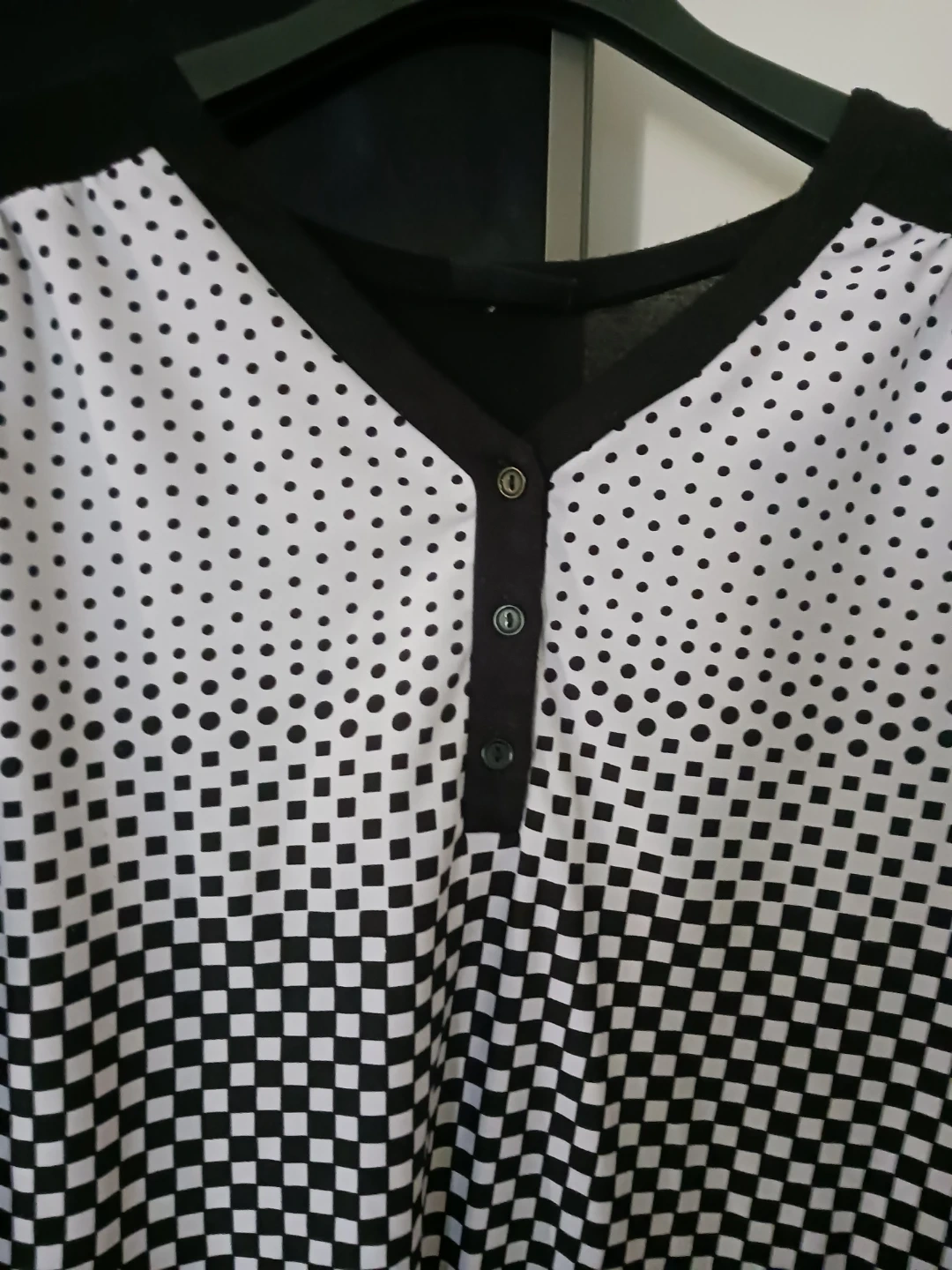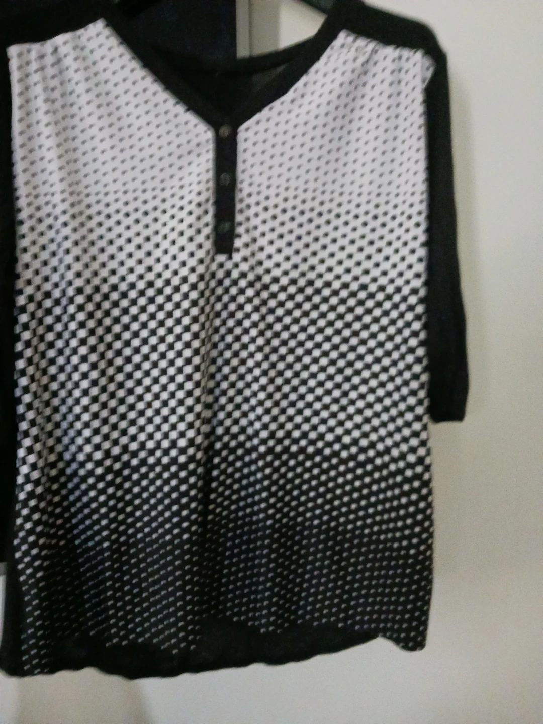 A stylish tunic top with a V-neck and button detail. It's designed with a black and white gradient checkered and dotted pattern. The sleeves are 3/4 length.