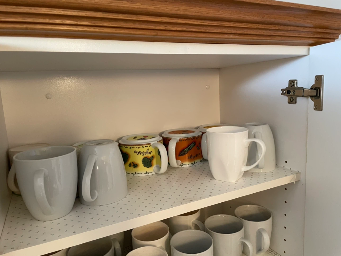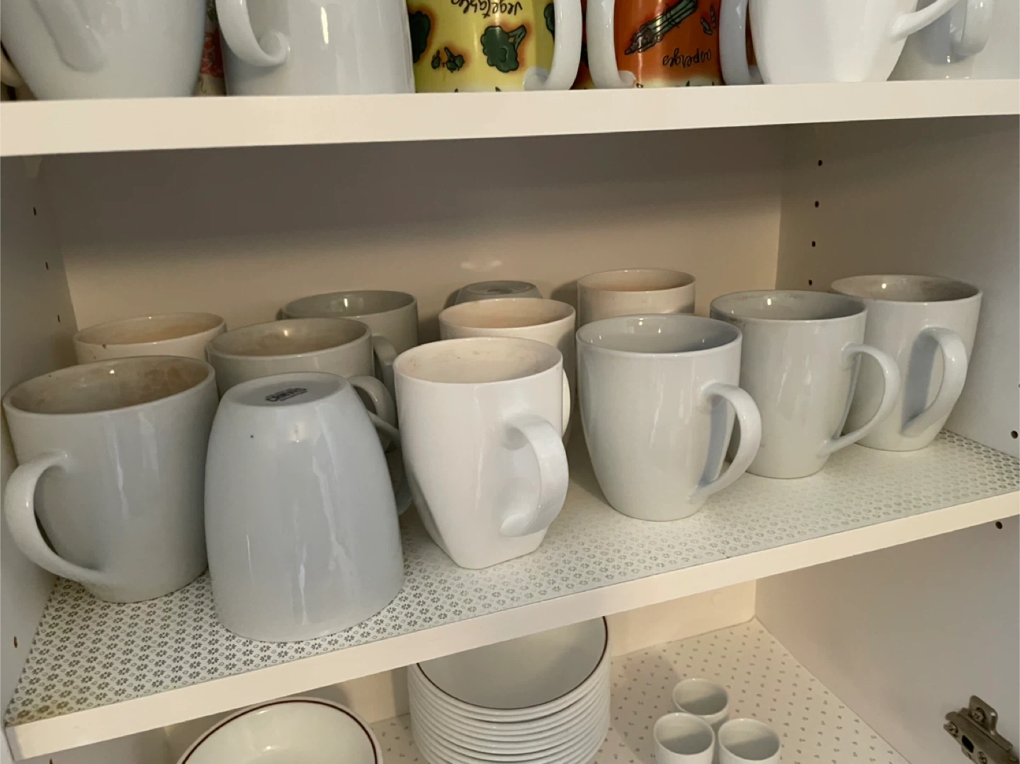 This is a collection of white ceramic mugs. Some mugs have decorative designs. Several small egg cups are also included. Great for everyday use!