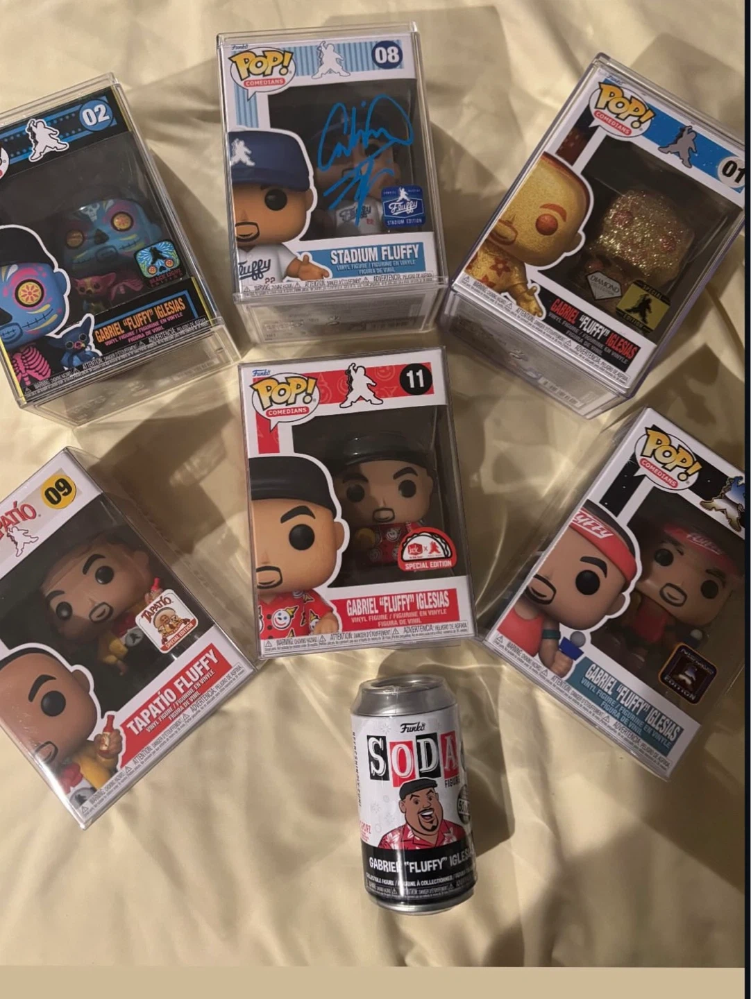 Collection of Funko Pop! vinyl figures featuring Gabriel "Fluffy" Iglesias. Includes Stadium Edition, Tapatío, and Diamond Edition figures, plus a Funko Soda can. Figures are in protective cases.