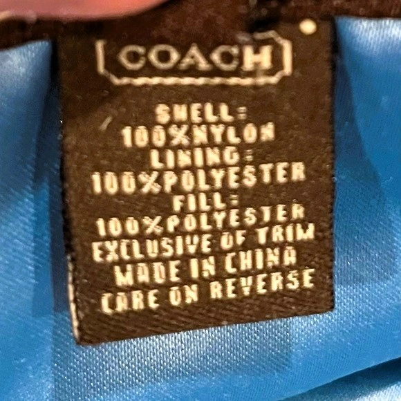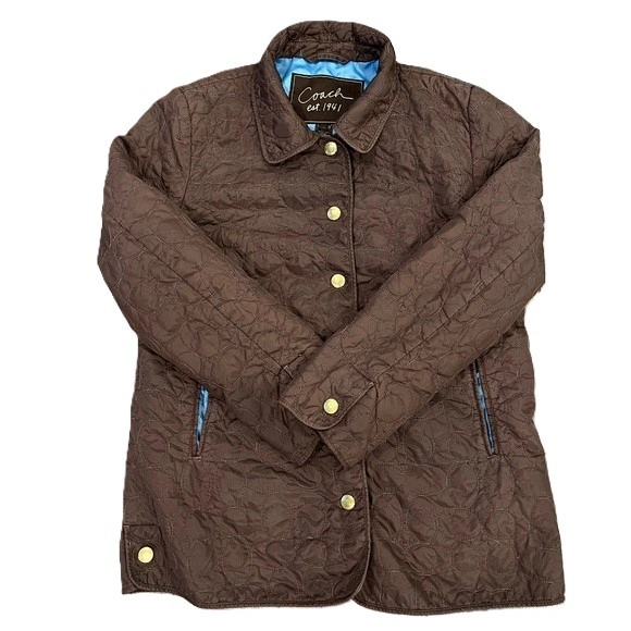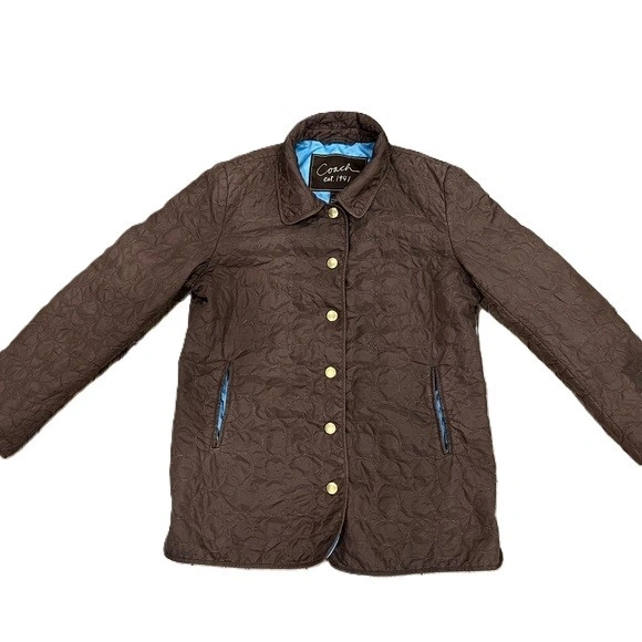 Original price $400. Elevate your layering game with this classic Coach Signature Quilted Jacket. This iconic piece blends equestrian style with urban utility, featuring the timeless all-over Signature C logo pattern in a rich dark brown. The vibrant turquoise blue lining adds a stunning pop of color when worn open or with the sleeves cuffed.