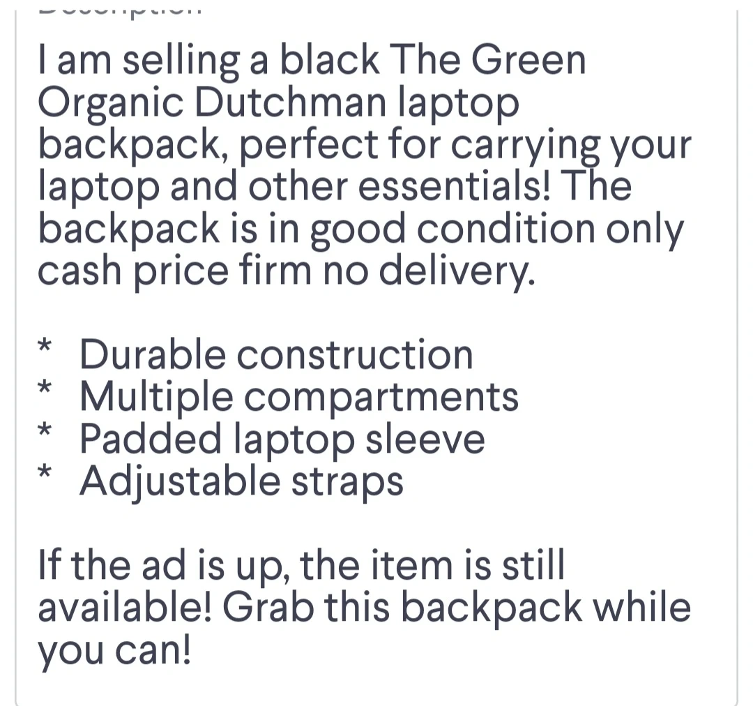 I have more Backpacks Crossbody Bags Belts Bags and Gym Bags for sale different prices different colors and different Brands if you want you can come to see all bags only cash.
