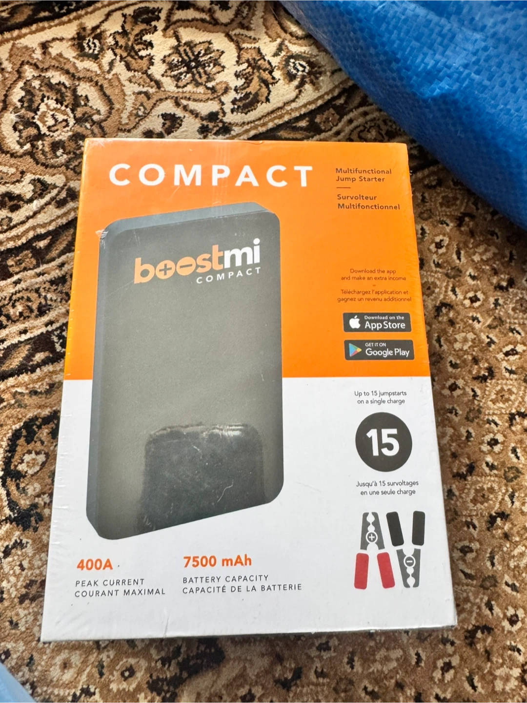 Selling a brand new Boostmi Compact Multifunctional Jump Starter! It's a handy device to have in your car for emergencies. It can provide up to 15 jumpstarts on a single charge. The battery capacity is 7500 mAh and the peak current is 400A.