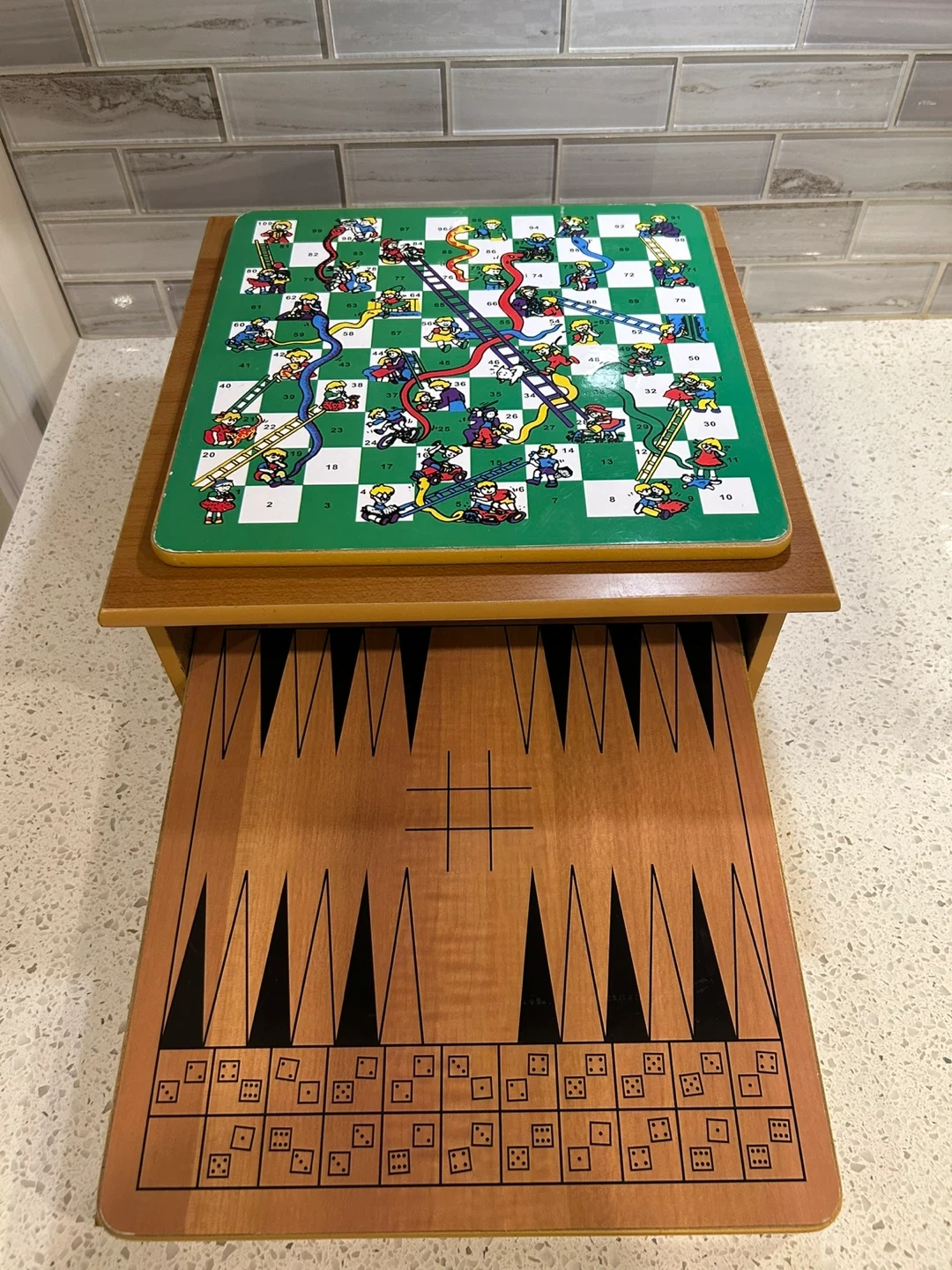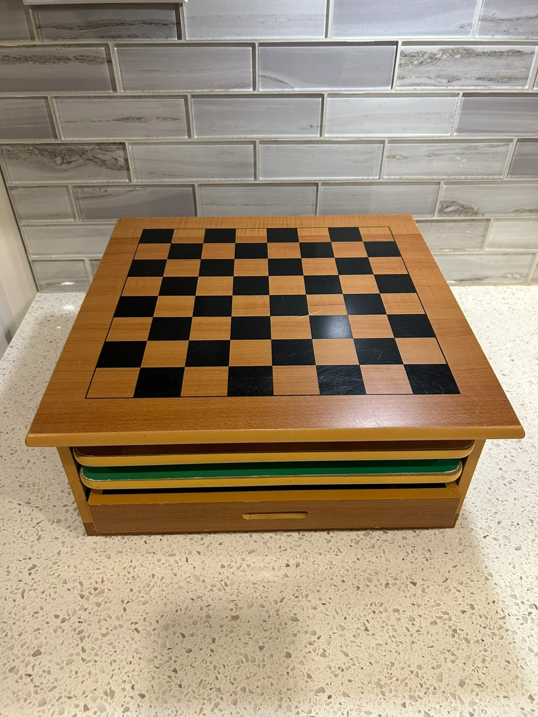 This wooden game box includes multiple playable boards. Chess, Chinese Checkers, peg solitaire board, Parcheesi / Ludo board, ladder board game. Great for family game nights!