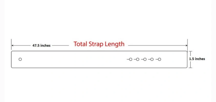 Total belt strap length 47.5 Inches Length (end to end of belt strap) X 1.5 inches Width