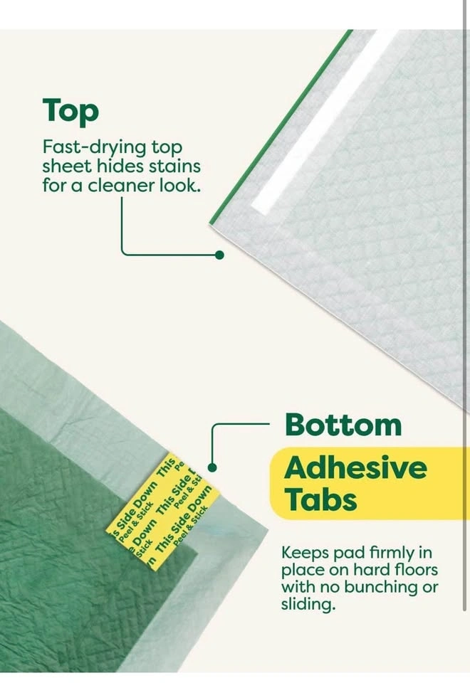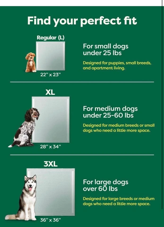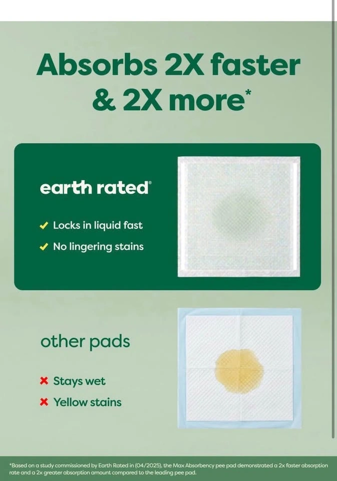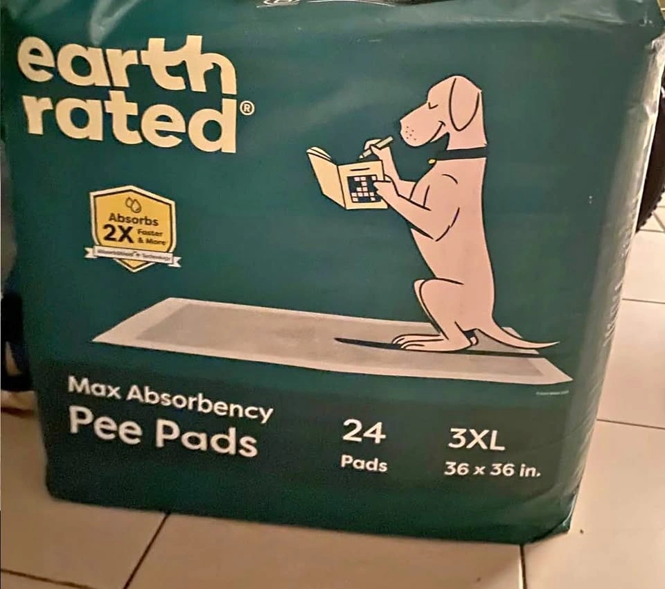 Brand new Earth Rated pee pads! These are the 3XL size, 36x36 inches, with 24 pads included. They are super absorbent for big dogs over 60 lbs, featuring Max Absorbency that soaks up 2x faster. AbsorbShield Technology helps prevent leaks and reduces paw tracking. Unscented with adhesive tabs on the bottom to prevent sliding.