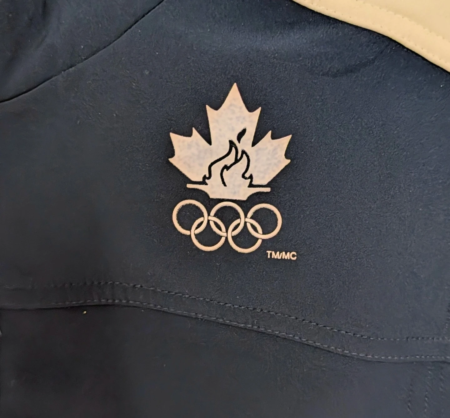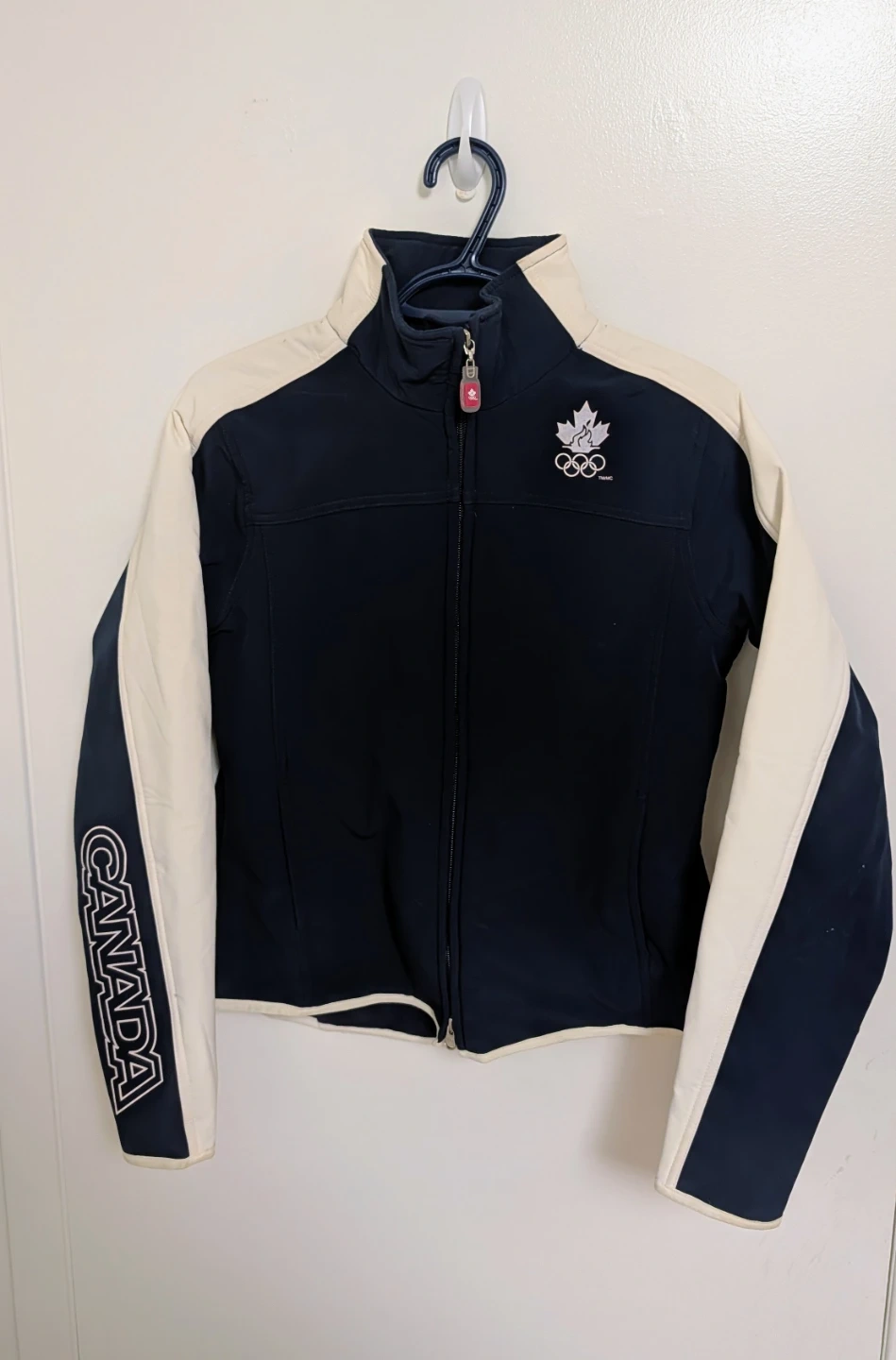 This HBC jacket features the Canadian Olympic logo and "CANADA" on the sleeve. It's made of 88% polyester, 12% spandex, with a fleece lining. Made in China.
