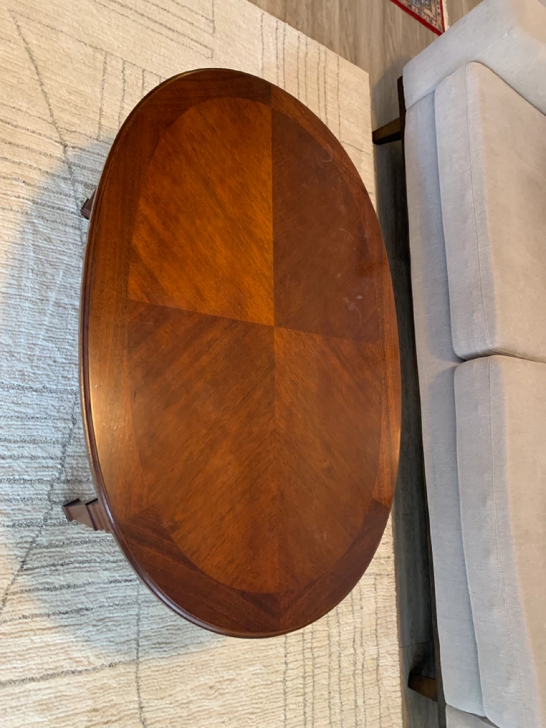 Solid wood coffee table with a rich mahogany finish. Features a decorative inlaid wood pattern on the tabletop. Dimensions are approximately 48" long, 30" wide, and 18" tall. A classic accent piece for your living room!