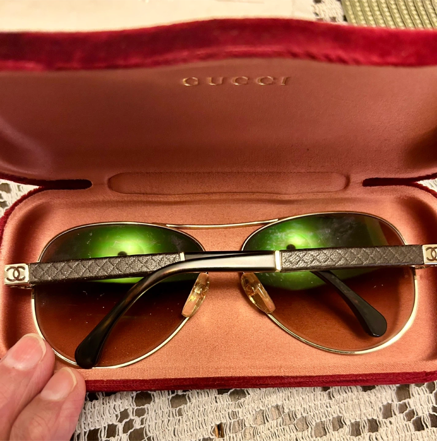 Beautiful aviator pilot sunnies . Leather quilted arms in brown . Cc on arm . Comes with a wine velvet hard case because I lost the Chanel case .
