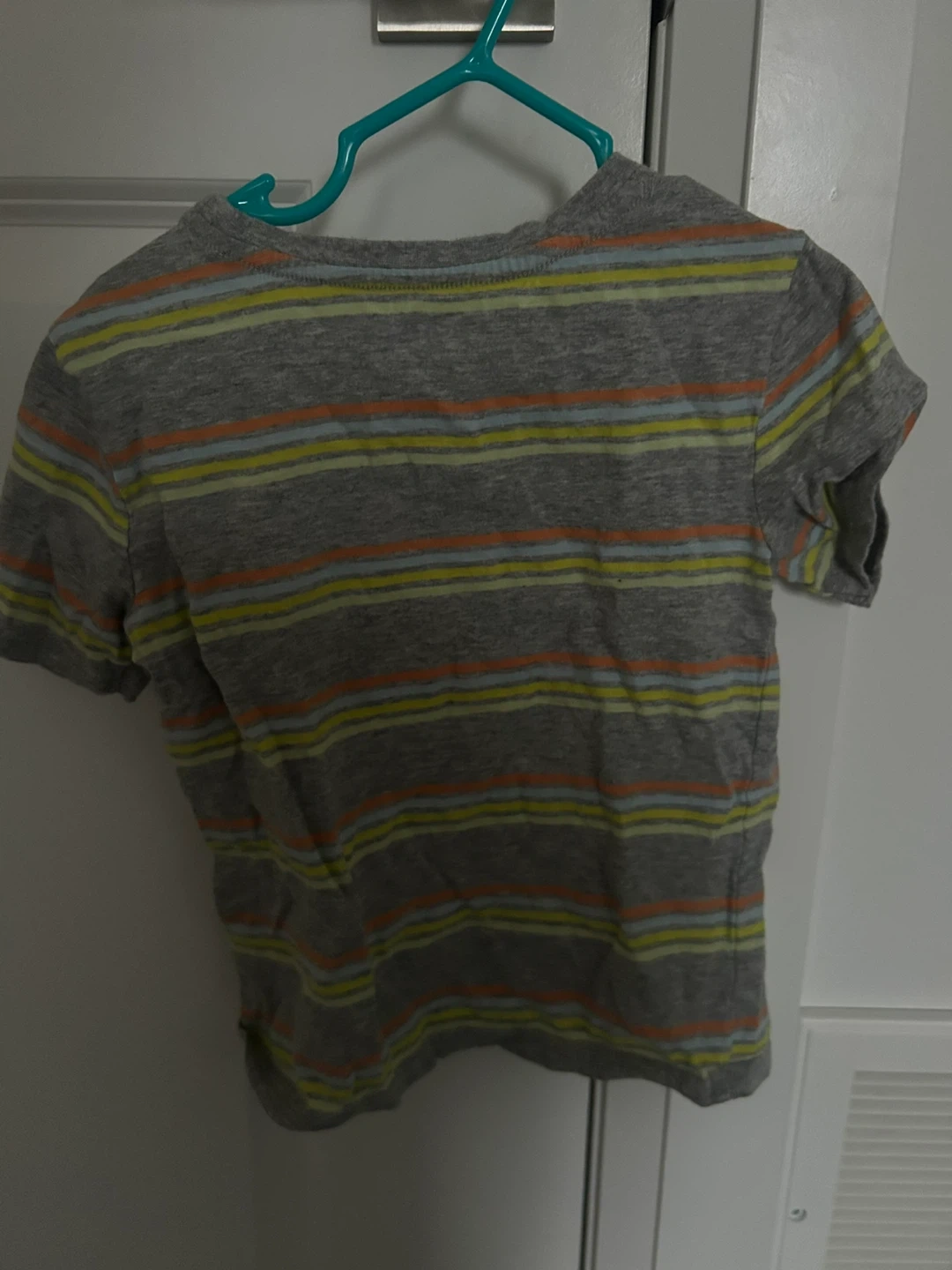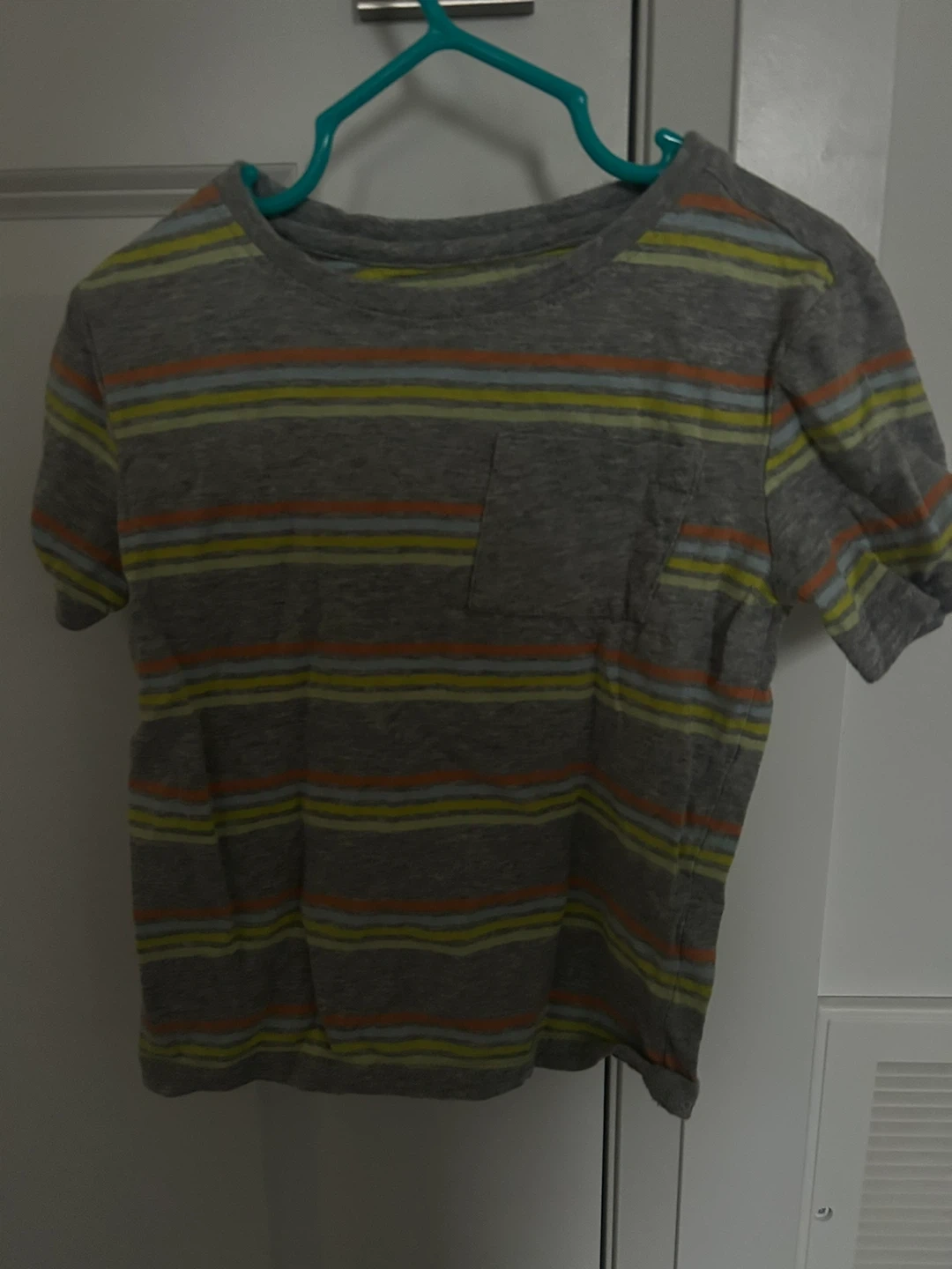 A comfy grey t-shirt with horizontal stripes in yellow, orange, and light blue. It's got a classic crew neck and a handy chest pocket. Perfect for everyday wear!