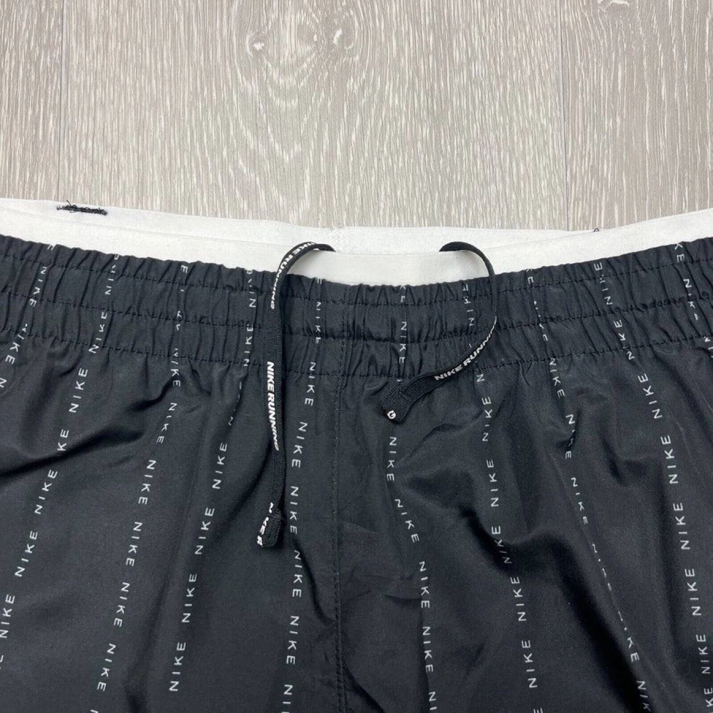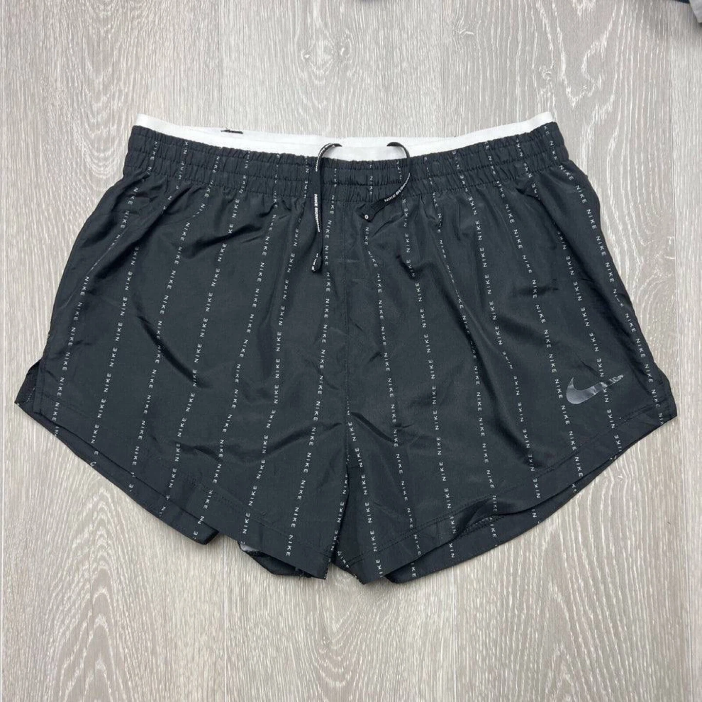 Nike running shorts. Black with white Nike logo print. Elastic waistband with drawstring. Side pockets. Lightweight fabric.