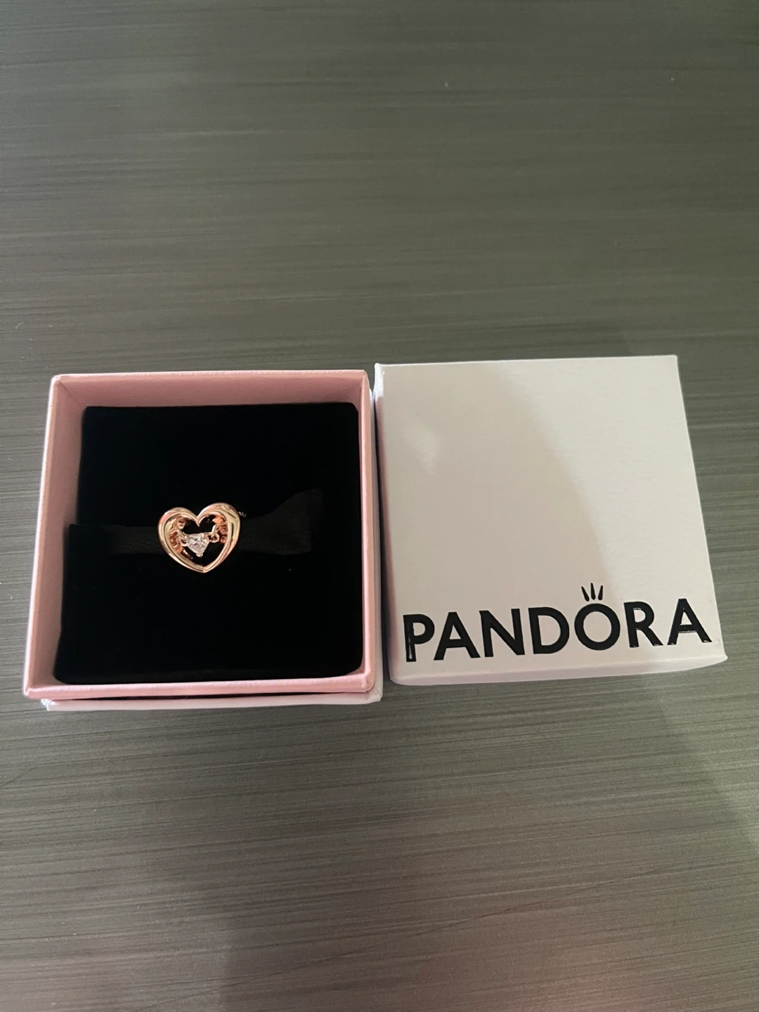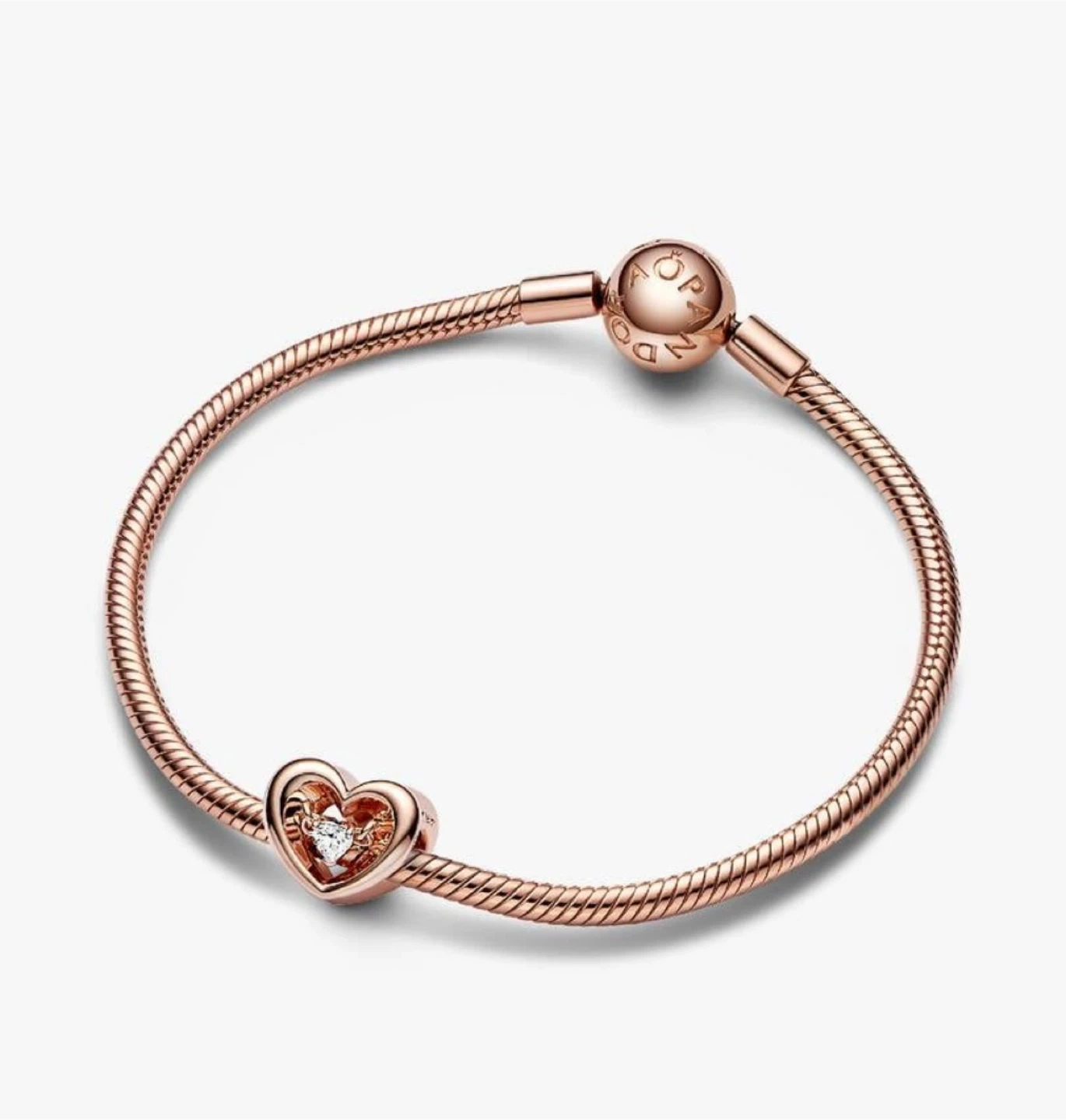This Pandora Rose charm features an open heart design with a dangling heart-shaped cubic zirconia that sparkles beautifully. It's inspired by the joining of two hands in a heart gesture. The charm is made from a 14k rose gold-plated unique metal blend.
