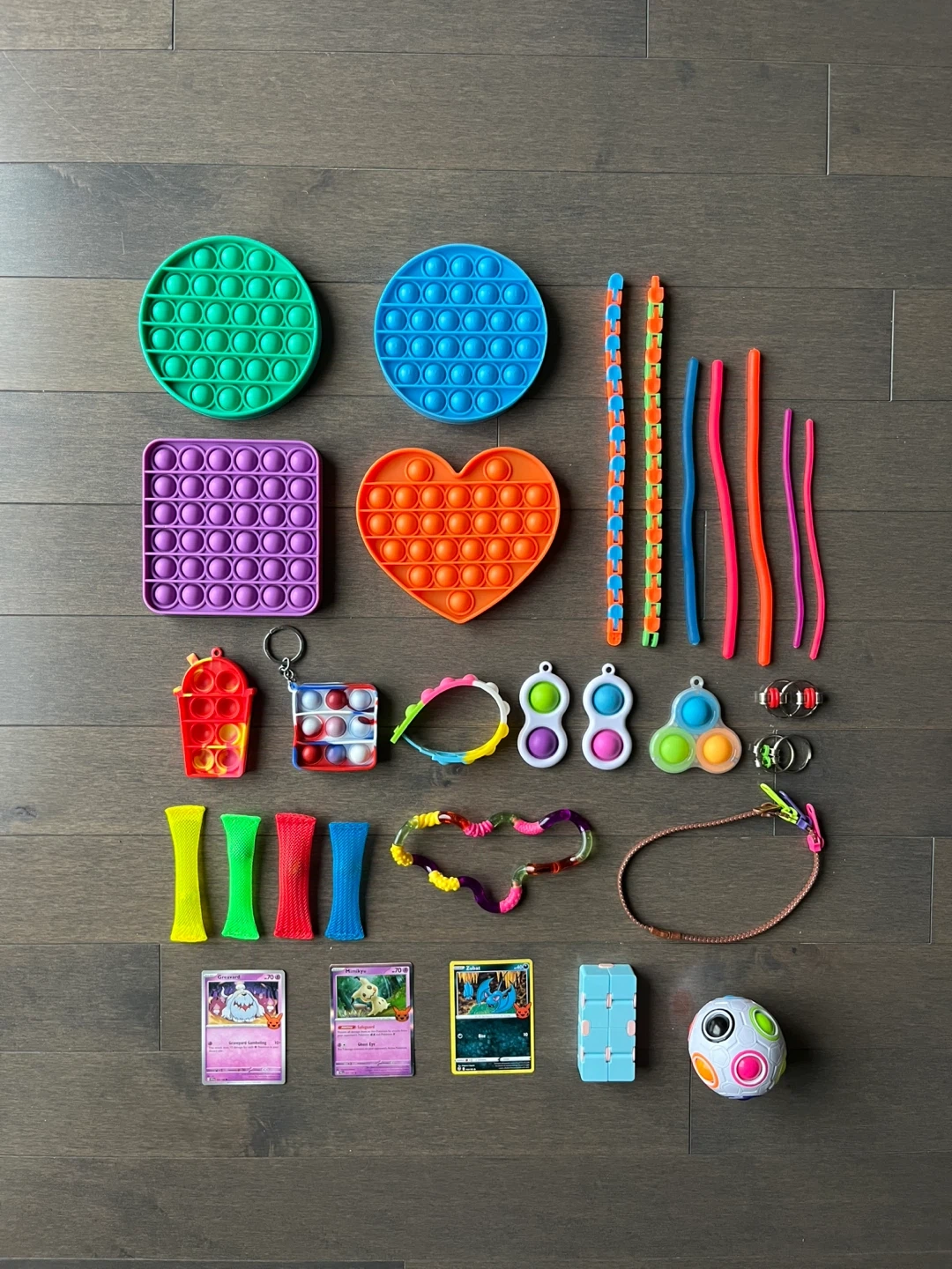 This bundle includes a variety of fidget toys. There are multiple pop-it toys in different shapes and colours, along with sensory noodles and stress balls. It also comes with a fidget spinner and two Pokémon cards.