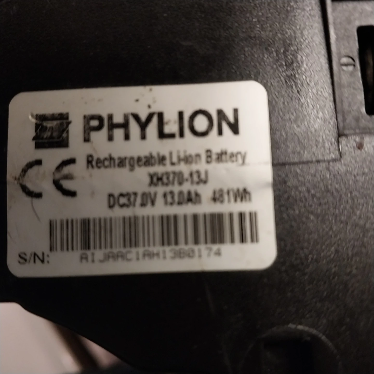 Phylion rechargeable Li-ion battery for e-bikes. It's a XH370-13J model with DC37.0V, 13.0Ah, and 481Wh capacity. This battery is suitable for powering electric bicycles.