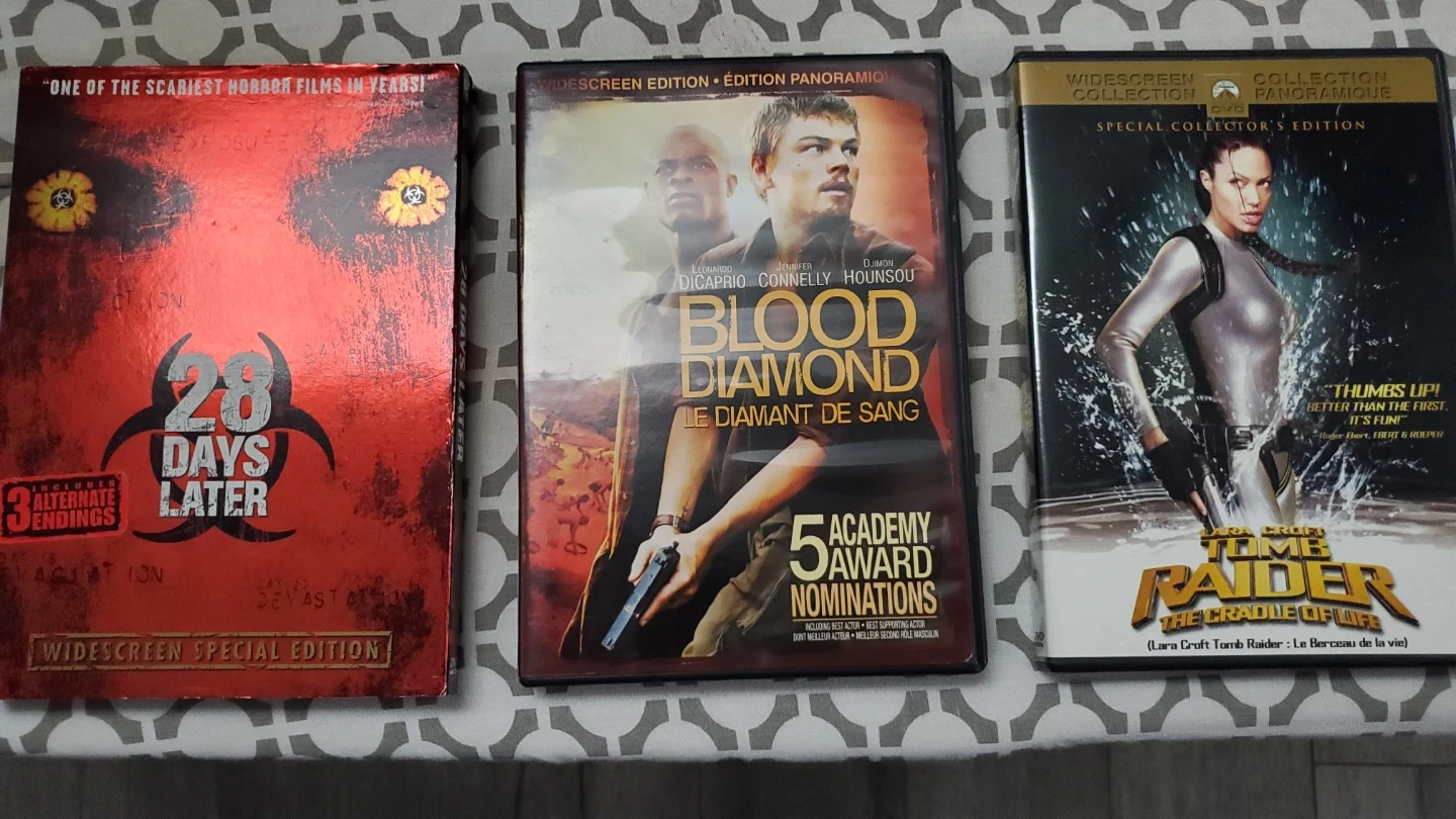This lot includes three DVDs: '28 Days Later' (Widescreen Special Edition), 'Blood Diamond' (Widescreen Edition), and 'Lara Croft: Tomb Raider' (Special Collector's Edition). All discs are in good condition and come with their original cases. $20 for all three or buy individually.
