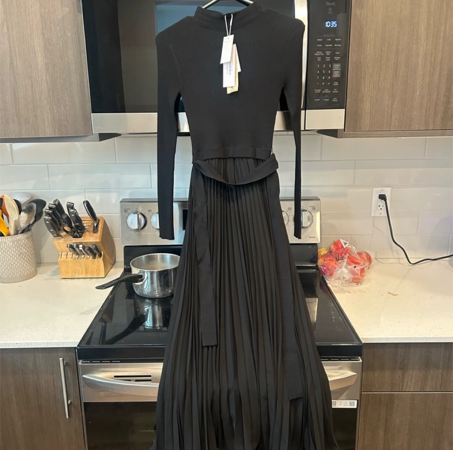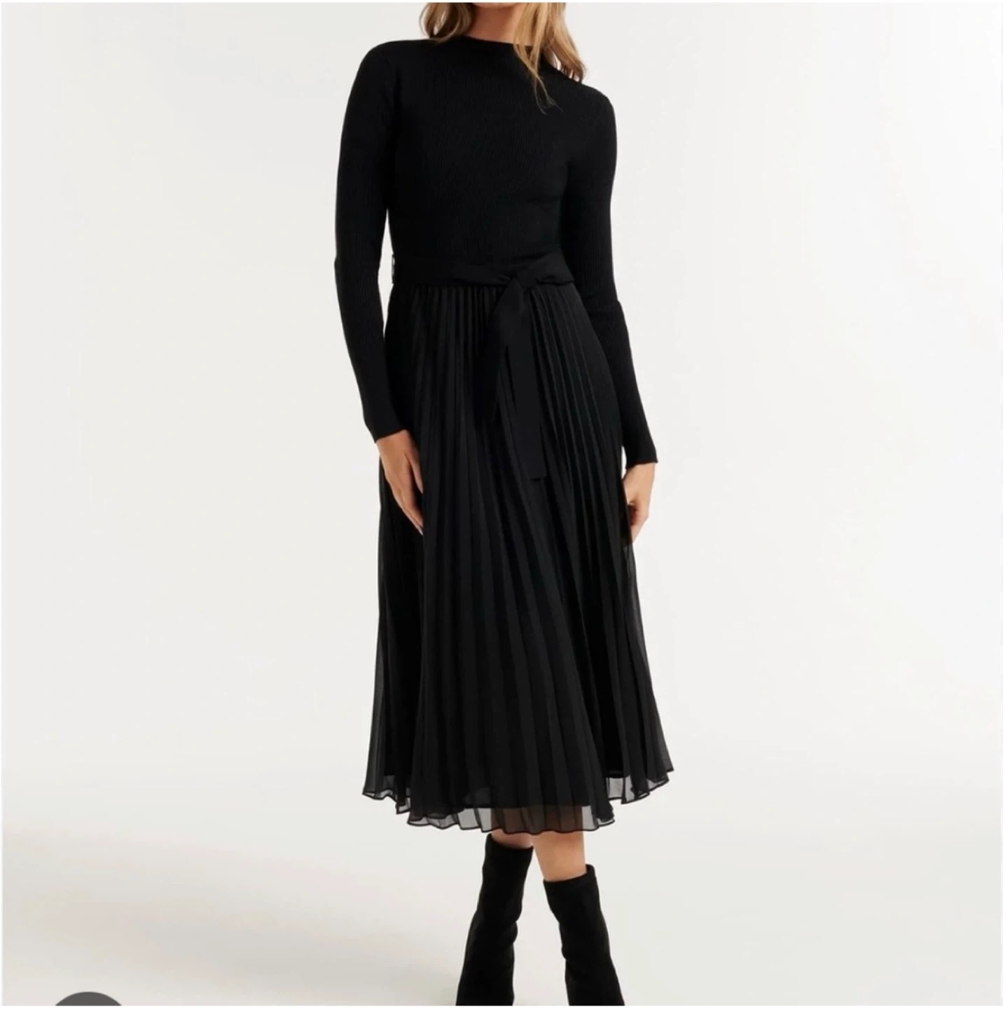 This Ever New Melbourne dress features a black knit top with a long sleeve and a pleated midi skirt. It comes with a removable tie belt. Made from recycled polyester.