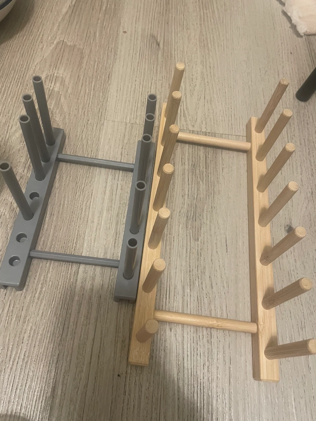 Two bottle drying racks included, one made of bamboo and the other in a grey plastic material. These are handy for drying water bottles or other similar items.