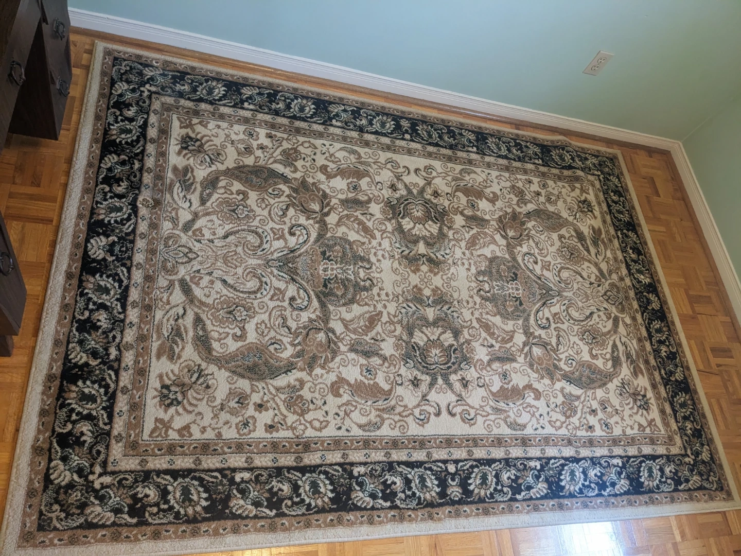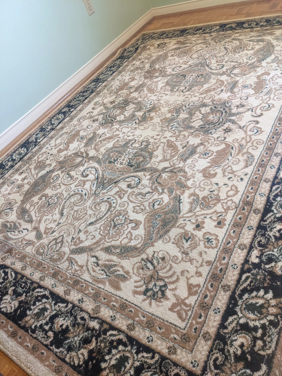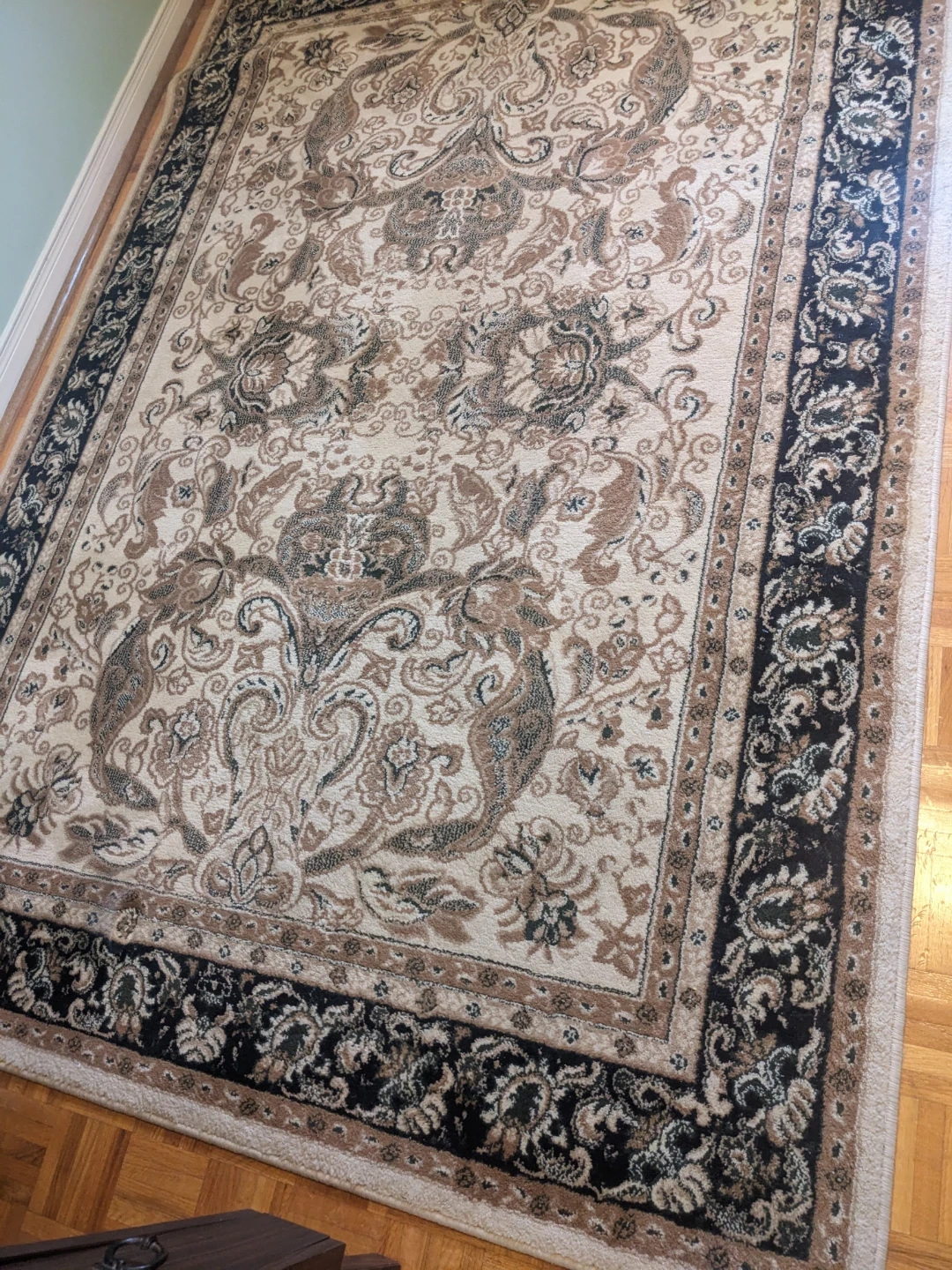 This large area rug features a classic oriental design with intricate paisley and floral motifs. Its neutral colour palette makes it a versatile addition to any room. The rug has a dense pile and is in good condition.