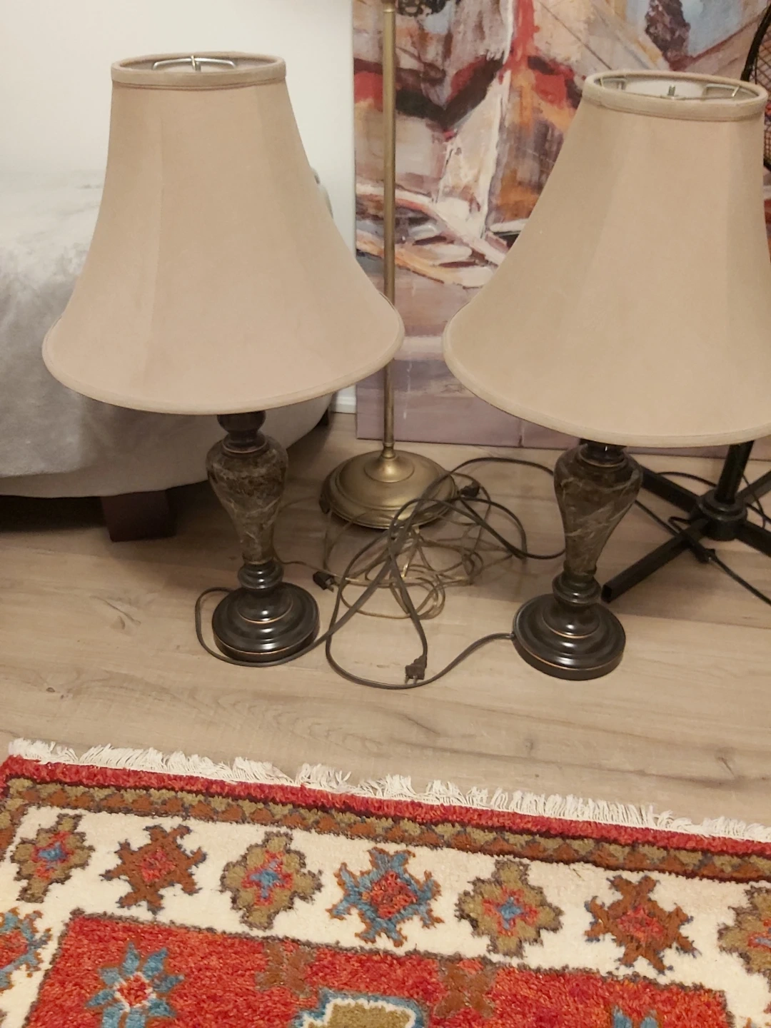 This set includes two matching table lamps with beige fabric shades. The lamp bases have a decorative, marble-like pattern and a dark bronze finish. They're perfect for adding ambient lighting to a living room or bedroom.