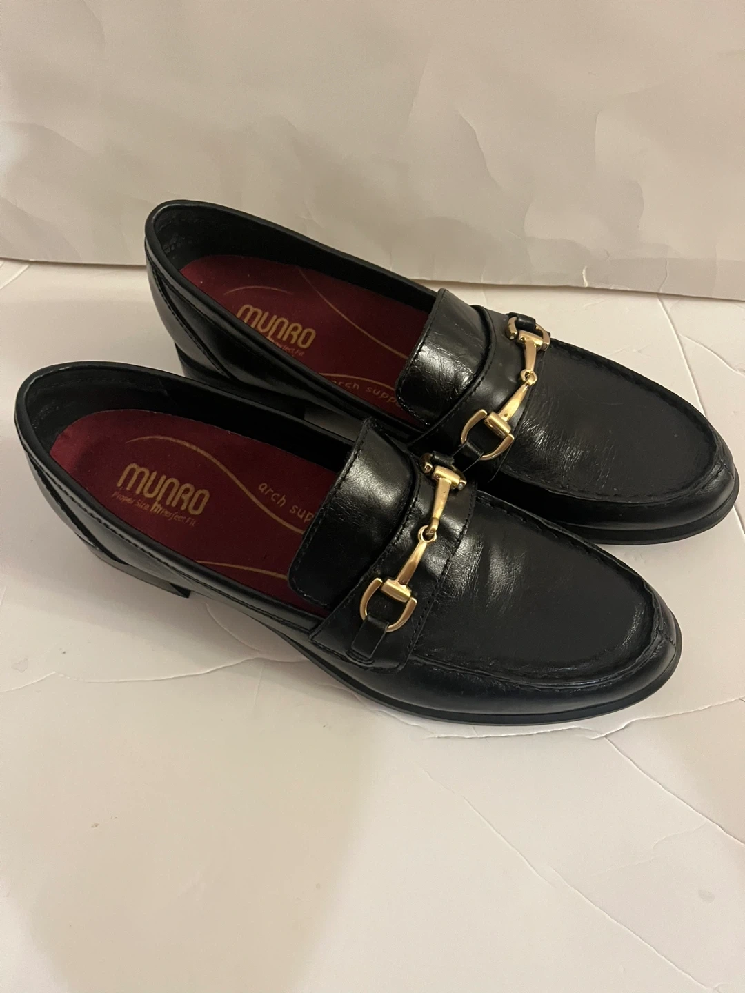 Munro women's black leather loafers with gold hardware accents. Features arch support for all-day comfort. Made with quality leather.