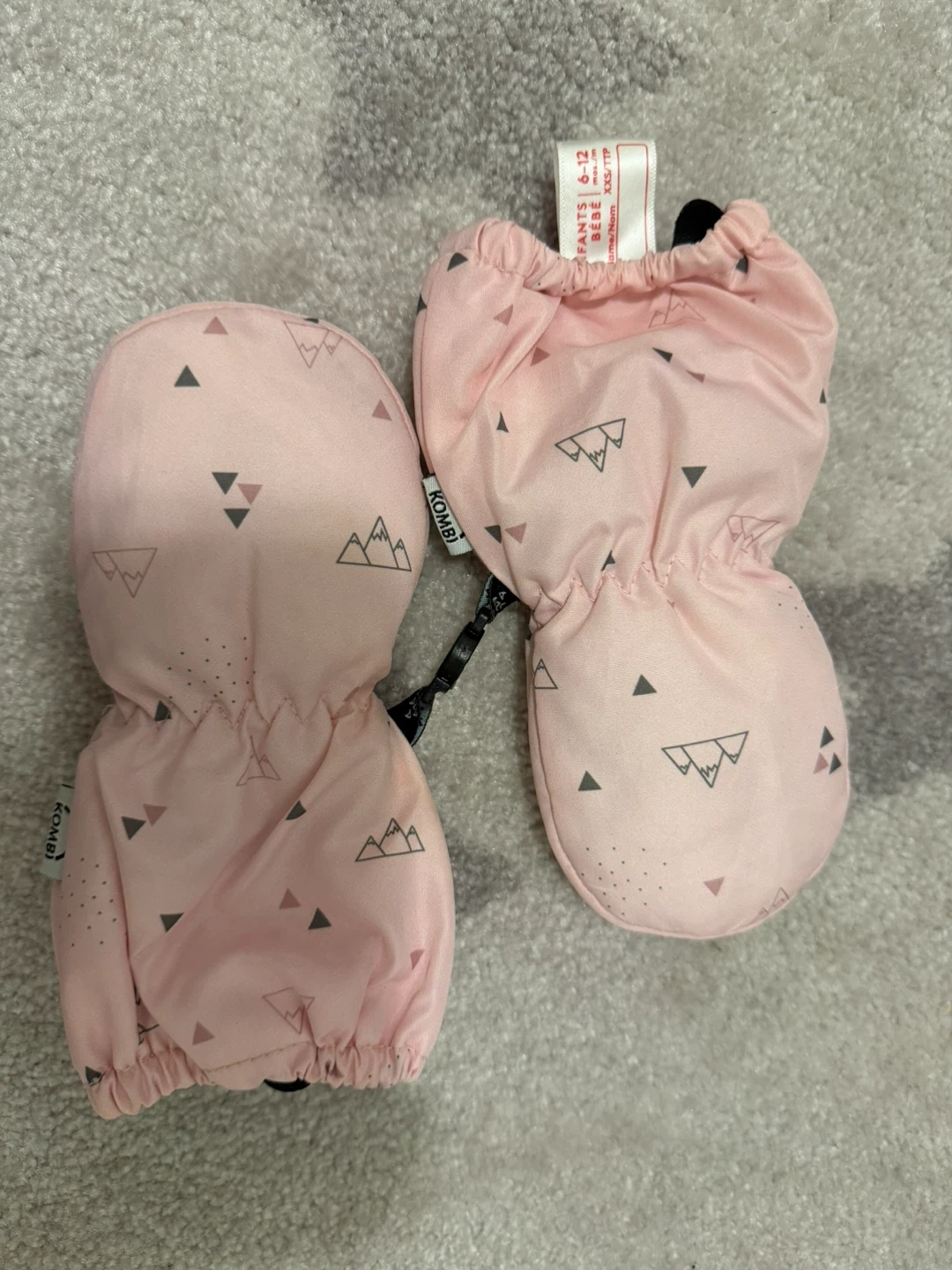 These Kombi baby mittens are a cute pink with a mountain and triangle pattern. They're designed for infants aged 6-12 months. Perfect for keeping little hands warm during cooler weather!