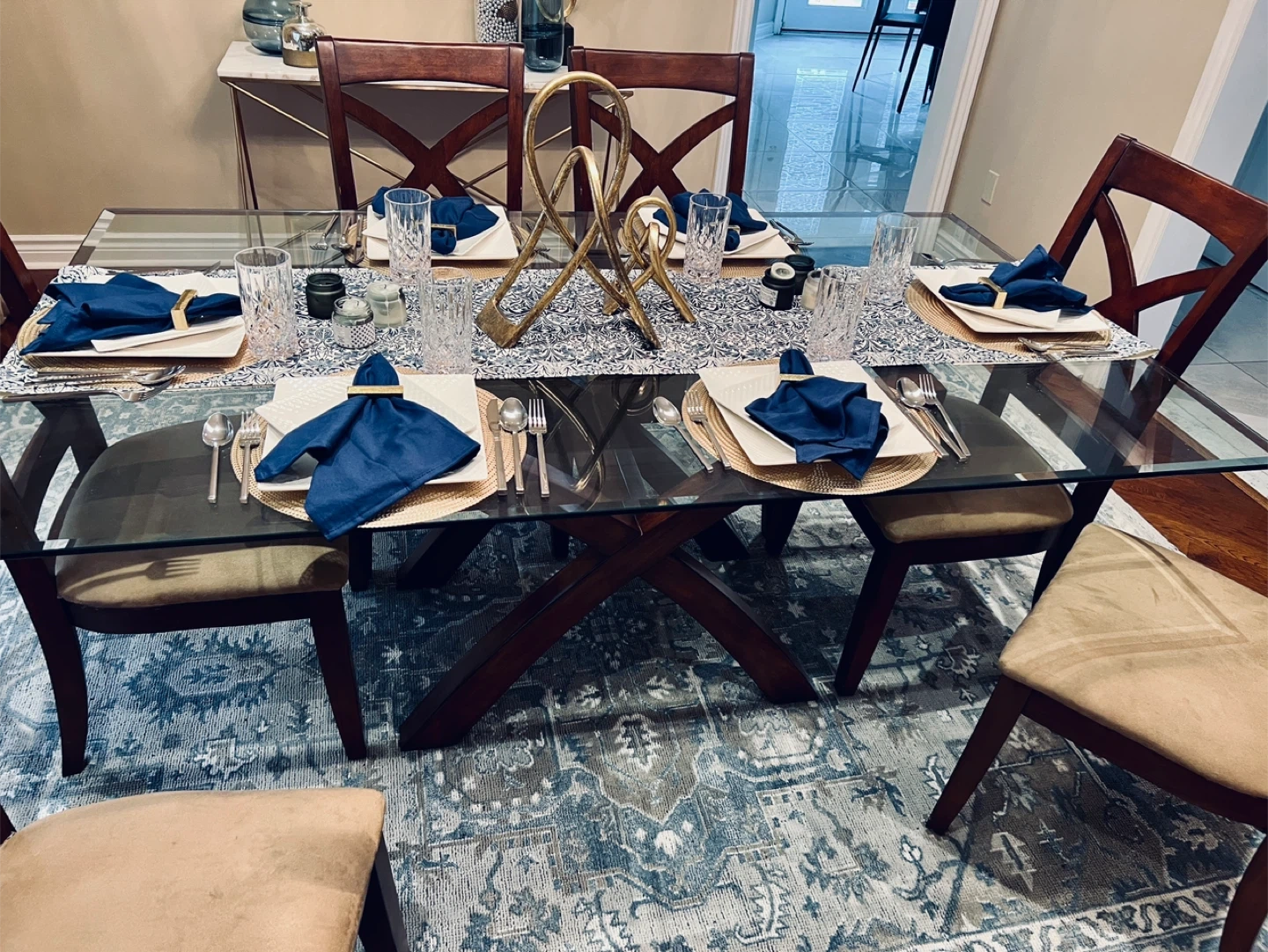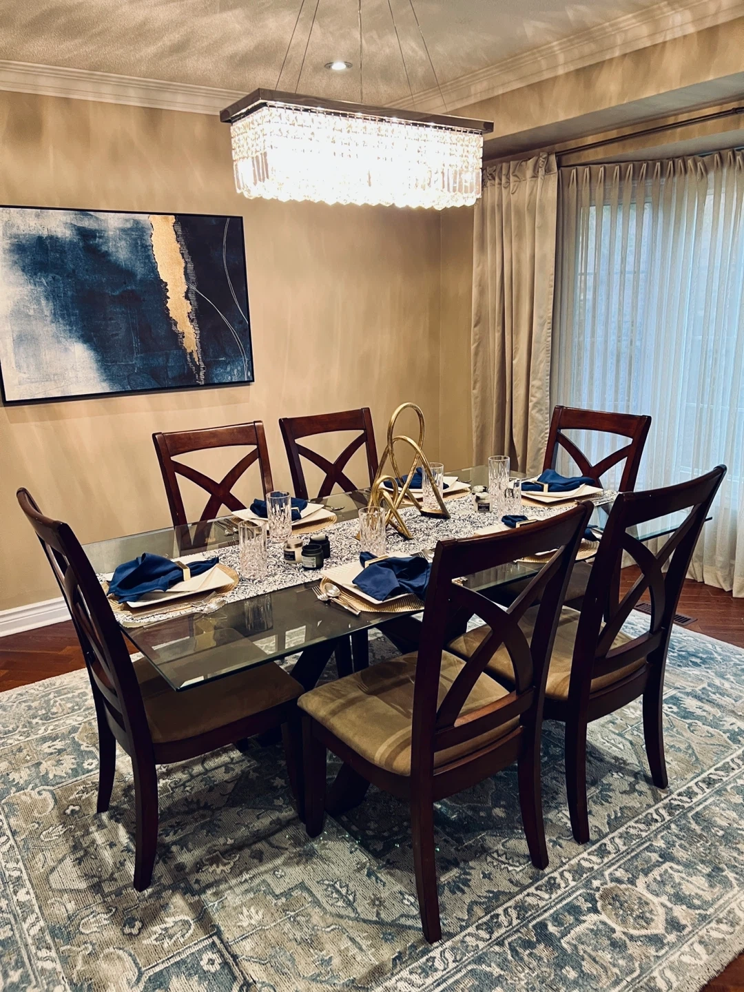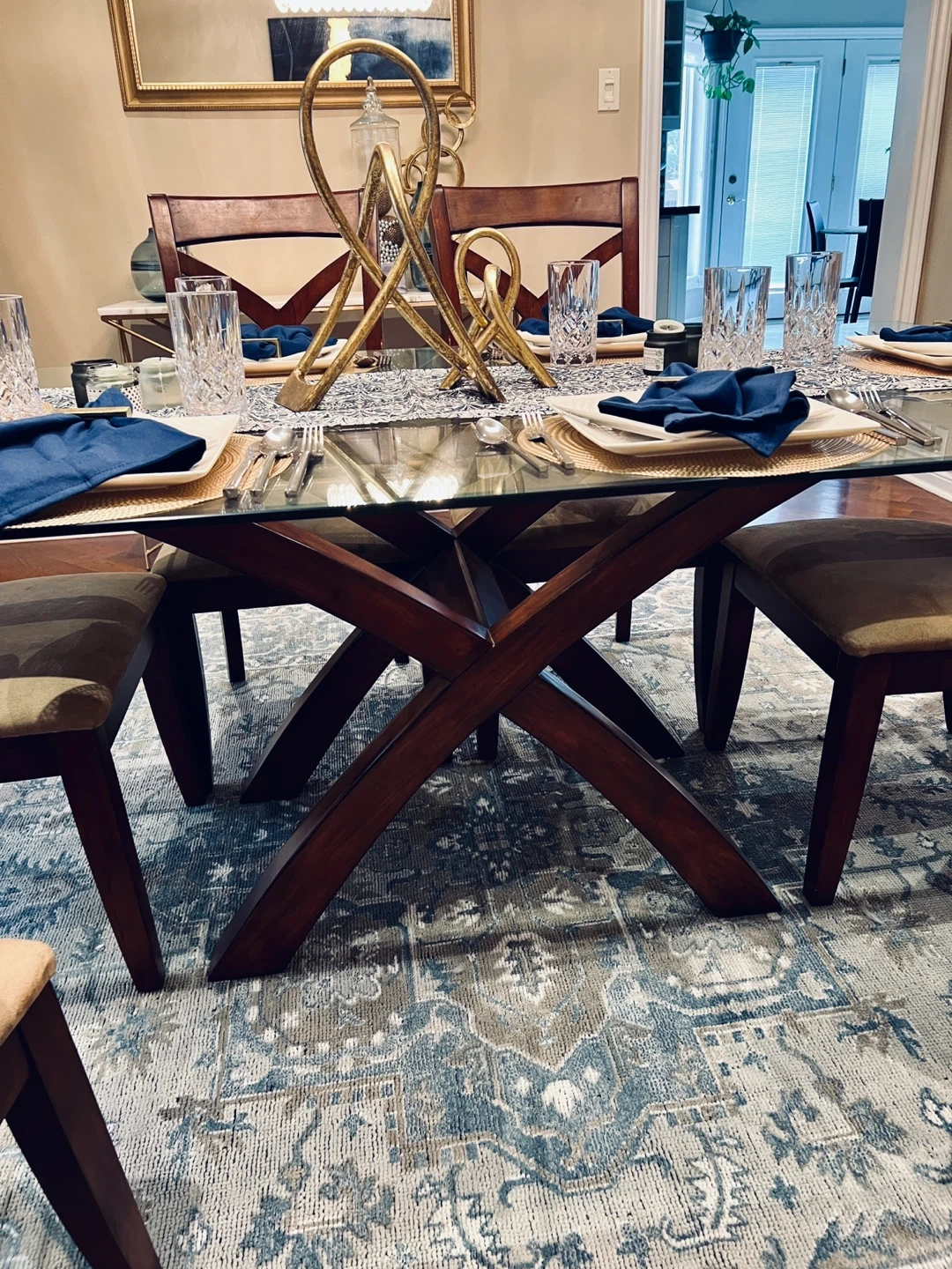 Selling a glass-top Dining table with 6 chairs, perfect for family dinners and gatherings. The chairs have a unique cross design on the back and are upholstered with a comfortable beige fabric.