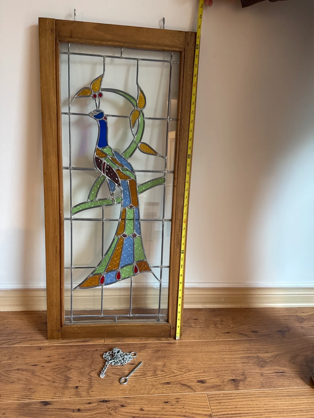 A beautiful stained glass panel featuring a peacock design. It's framed in wood and includes hanging hardware. Approximate dimensions are 17.5 inches wide by 37.5 inches tall.