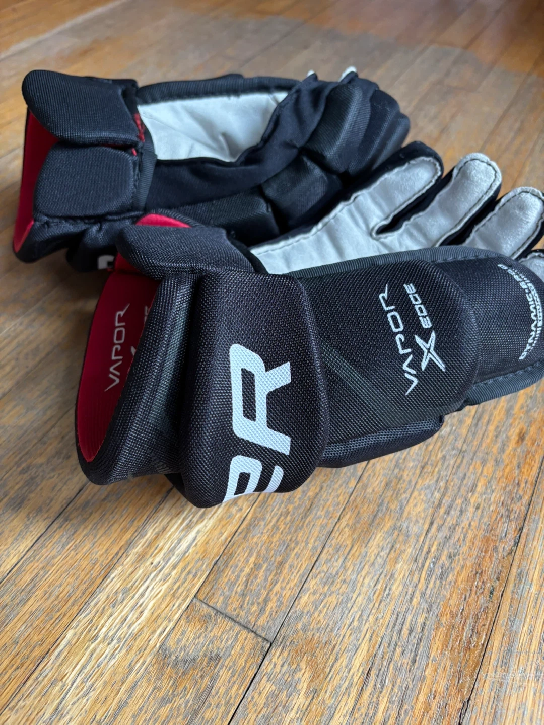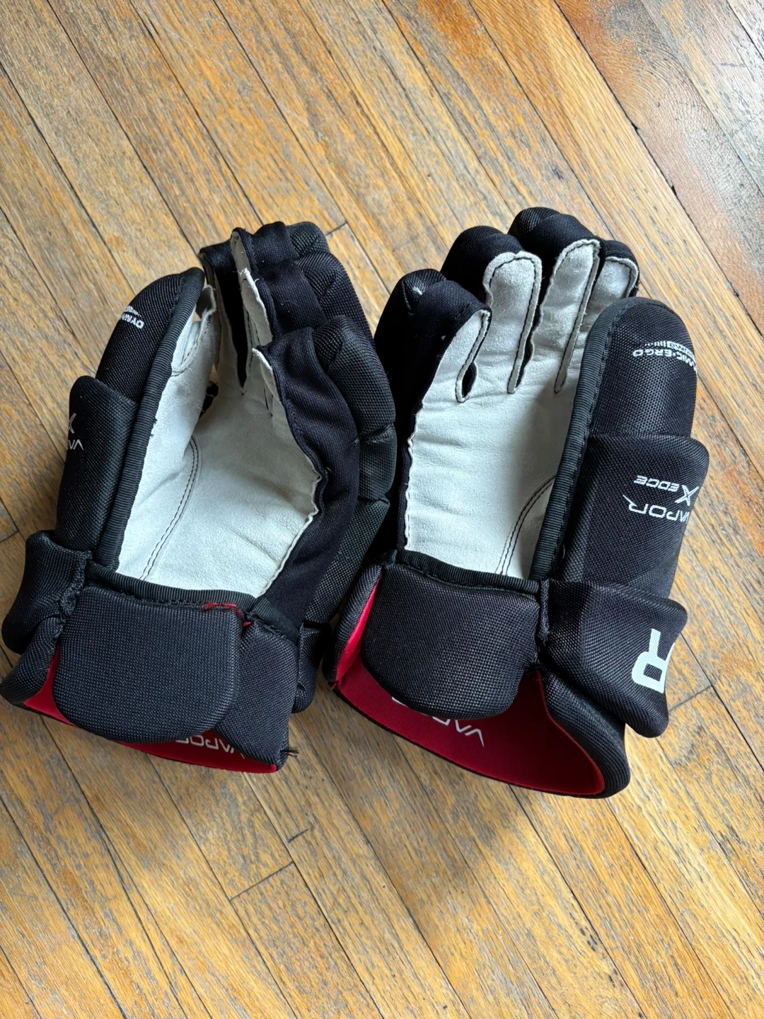 These are a pair of Bauer Vapor X Edge hockey gloves. They're black with red accents and grey palms. Includes protective padding and a comfortable lining. 12 inch 30 cm